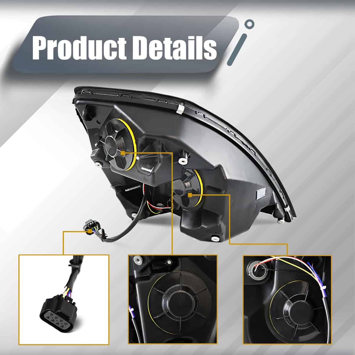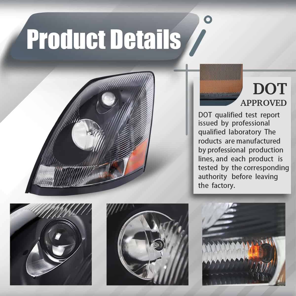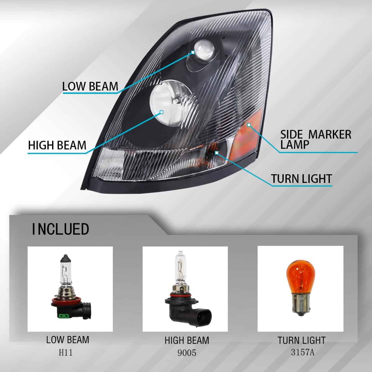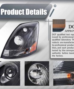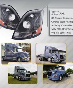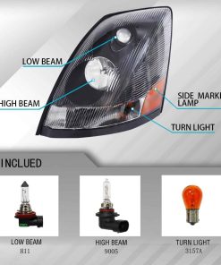 Faros negros de repuesto para Volvo VNL 2004-2014, compatibles con el lado izquierdo del conductor. Cuentan con tecnología halógena y lente de proyector, ofreciendo una visión clara y nítida. La instalación es sencilla, con operación Plug-n-Play, diseñados para adaptarse correctamente a las dimensiones originales. Fabricados con carcasa de plástico ABS de alta calidad y lente de policarbonato para una resistencia excepcional a impactos y durabilidad prolongada. Incluye paquete de protección de espuma AB; con una garantía normal de 6 meses para daños no causados por factores humanos.