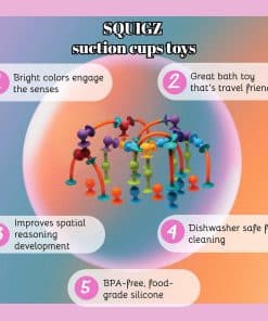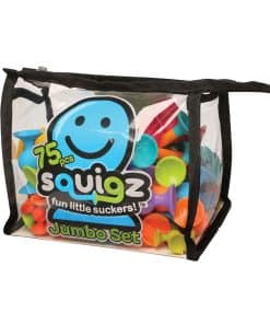 ¡Squigz son los innovadores juguetes de construcción de ventosa que se adhieren entre sí y virtualmente a cualquier superficie plana, luego se separan con un POP satisfactorio! Una variedad de formas y colores interesantes, de tamaño regular y mini, forman este exclusivo conjunto jumbo de 75 piezas de divertidos pequeños chupones. Incluye 75 Squigz suaves de silicona libre de BPA en 13 formas geniales y colores llamativos para horas de entretenido juego creativo. Además de estar diseñados de forma segura, son fáciles de limpiar directamente en el lavavajillas y no dejan ningún residuo ni marcas en tus mesas, ventanas y otras superficies planas. Los juguetes Squigz fomentan la imaginación y la interacción de un niño, así como ayudan en la estimulación sensorial y el desarrollo de habilidades motoras, coordinación mano-ojo, pensamiento visual y concentración. También son una excelente herramienta de relajación para adultos, permitiendo una actividad calmante que fomente la atención plena. Mantén este versátil conjunto de Squigz en una sala de juegos, aula o guardería y siempre ten a mano diversión pegajosa. Son perfectos para su uso como juguete de bañera, ya que no tienen superficies internas que retengan el agua. La práctica bolsa de almacenamiento con cremallera facilita llevarlos en viajes en coche, transportarlos a la escuela o llevarlos a la oficina para una divertida pausa. Ganador del premio ASTRA Best Toys for Kids y Oppenheim Toy Portfolio Gold, el conjunto de Squigz es un regalo impresionante para cualquier niño o jovial, a partir de 3 años en adelante, que ama construir y aprecia un juego único.