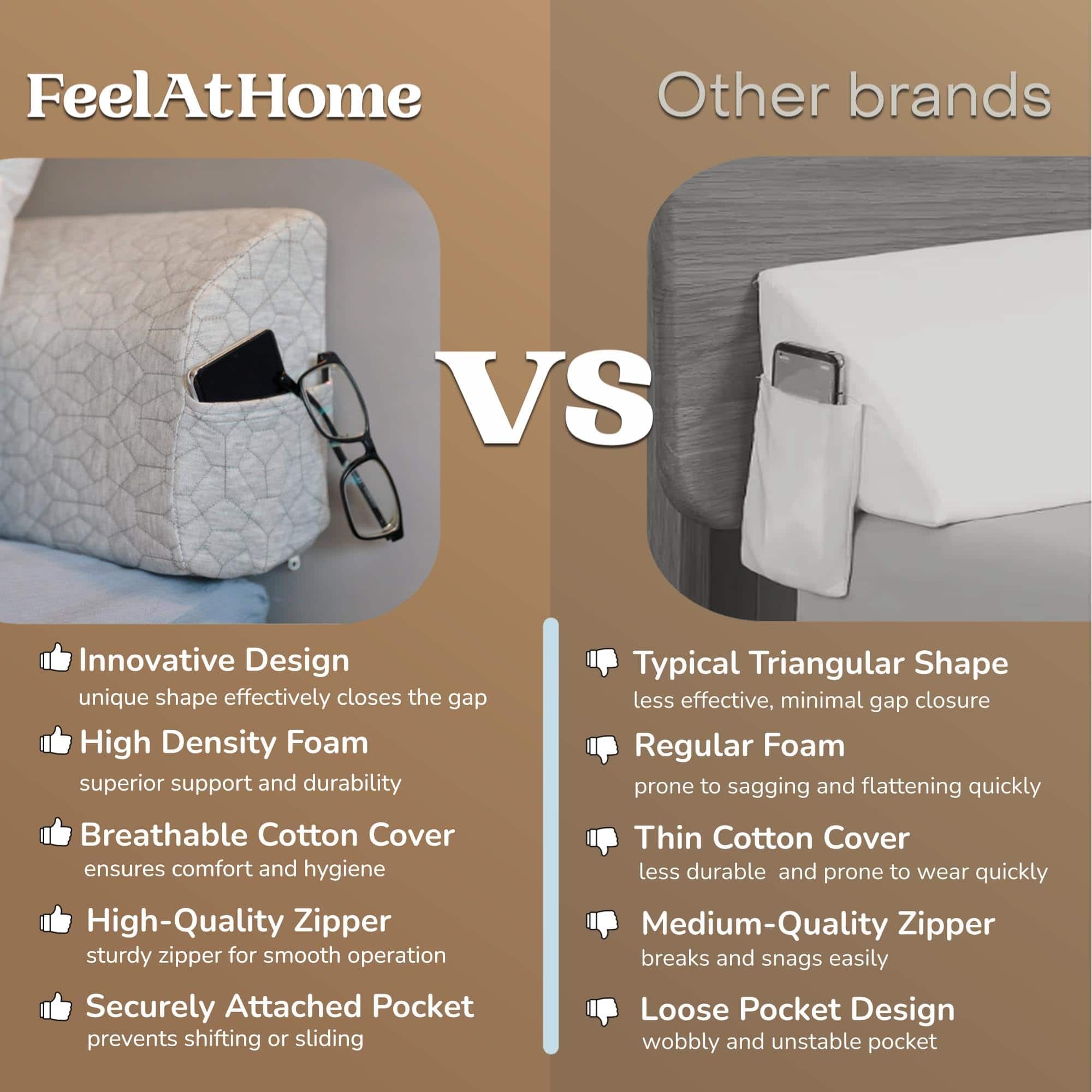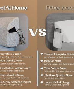 Además, este relleno de espacios para la cama incluye un bolsillo lateral que te permite almacenar objetos como teléfonos inteligentes, gafas de lectura, control remoto y más. Su uso es versátil, ya que puede transformarse fácilmente en almohada para la cama, posicionador para cama, tope para cabecera, soporte lumbar o soporte para las piernas, entre otros usos. Mejora tu rutina de descanso y disfruta de noches más placenteras con el relleno de espacios para la cama FeelAtHome.