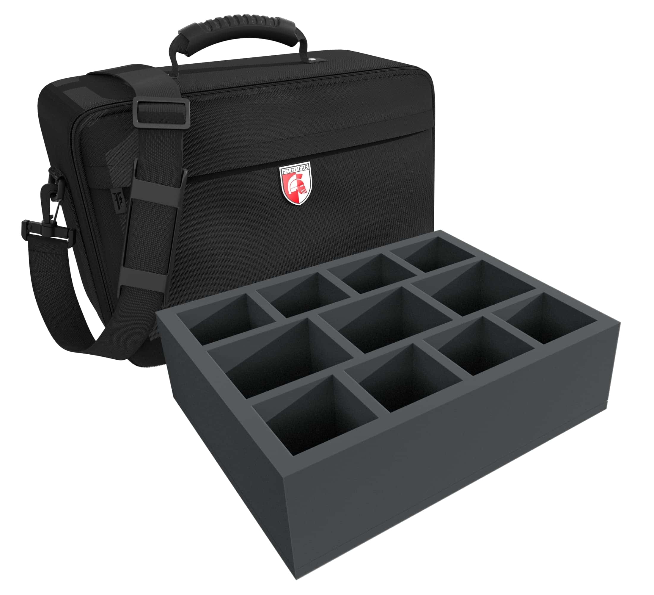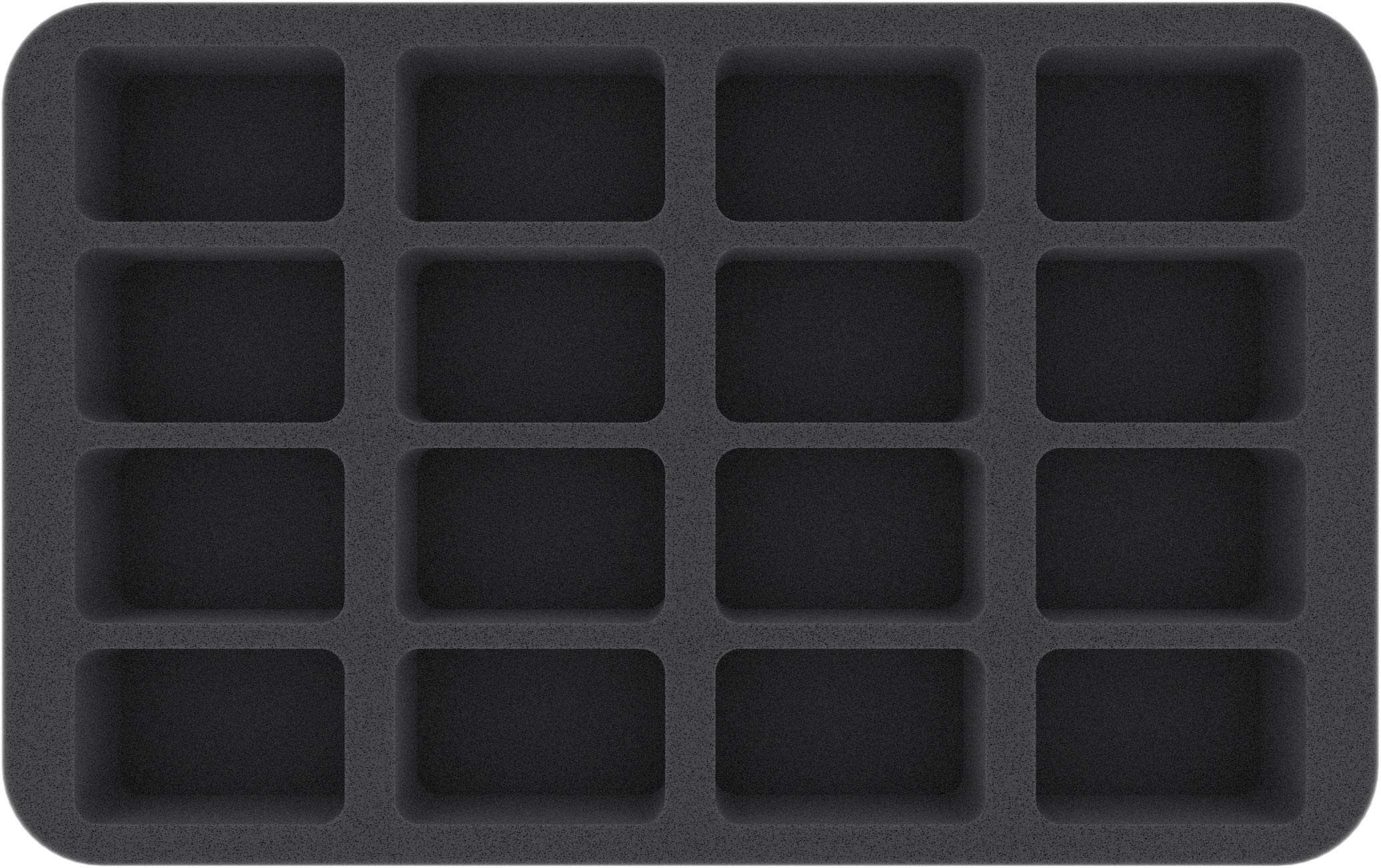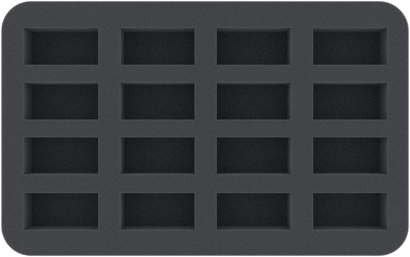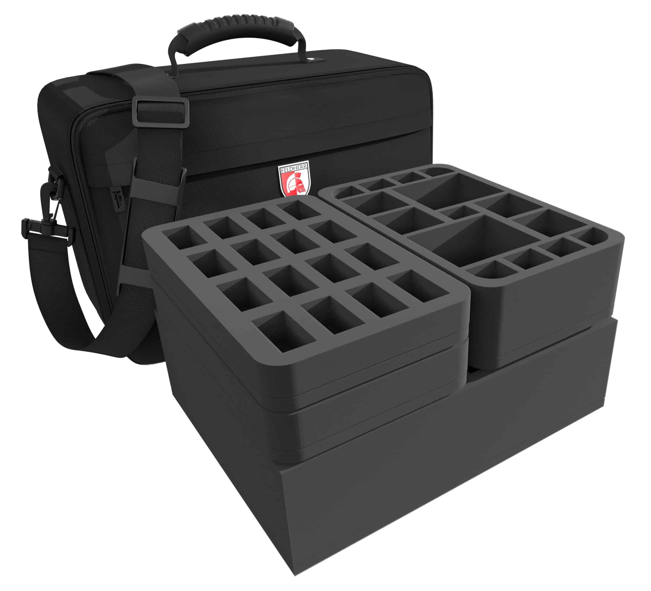 Desde goblin a gigante, desde pequeño a enorme – en un total de cuatro inserts de espuma de Feldherr tienes suficiente espacio para tu colección. Hasta 58 miniaturas encuentran un nuevo hogar aquí.