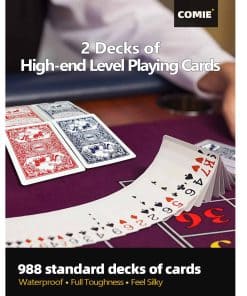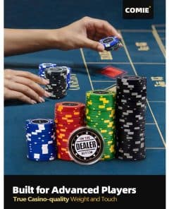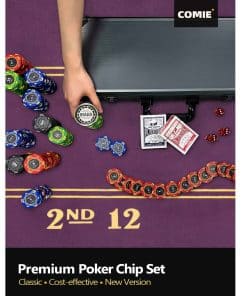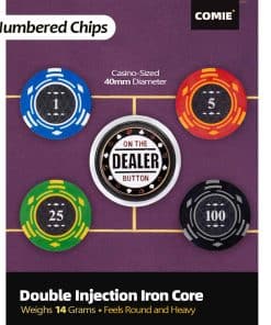 Set de fichas de póker clásico perfecto para 8 a 10 jugadores en juegos como Texas Hold ‘em, blackjack, torneos, clubes de cartas, y más. Incluye 400 fichas de póker profesionales de 40mm de diámetro en varios colores: $1-100 fichas azules, $5-150 fichas rojas, $25-100 fichas verdes, $100-50 fichas negras. Además, 2 barajas estándar de cartas, 5 dados y 1 repartidor de lujo. No se incluyen botones de ciega pequeña y ciega grande.