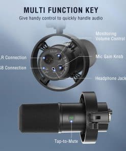 4. Silencio y Monitoreo: No es necesario ajustar la configuración del software en su computadora, puede silenciar el micrófono USB para PC a través del botón de silencio táctil para evitar situaciones repentinas. Ajuste la perilla de ganancia en el micrófono de podcast para ajustar finamente el audio a un nivel moderado. El conector para auriculares emparejado con la perilla de volumen de monitoreo le permite estar informado de la situación en el micrófono de estudio de grabación, haciendo que su grabación sea más efectiva.