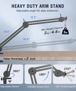1. Brazo de Micrófono Articulado: Fabricado en metal resistente, el soporte de micrófono de brazo de suspensión permite soportar un peso de hasta 2 kilogramos, lo que sujeta de forma segura su micrófono dinámico XLR para reducir colisiones y vibraciones durante podcasts o streaming. Puede estirar el brazo del micrófono de transmisión verticalmente hasta 180° u horizontalmente hasta 135° para lograr un ajuste y extensión flexibles para un audio más atractivo y resonante.