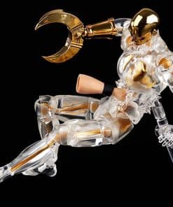 De Max Factory/Good Smile Company. «Cobra… parece que finalmente podremos saldar cuentas hoy.» El tercer personaje en unirse a la serie figma COBRA es el archienemigo de Cobra, Crystal Bowie. Usando las articulaciones suaves pero posables de figma, puedes representar una variedad de escenas diferentes. Se utiliza un plástico flexible en áreas importantes, lo que permite mantener las proporciones sin comprometer la posabilidad. El aspecto único y transparente de Crystal Bowie y su esqueleto dorado se han mantenido fielmente sin exponer sus articulaciones. Se incluye un brazo estándar adicional y un vaso de whisky para escenas no combativas. Se incluye una parte del torso dañada para recrear una de sus épicas batallas con Cobra. Su cabeza, mano con garra y varias otras áreas utilizan un recubrimiento de pintura metálica para recrear su textura única. Se incluye un soporte articulado de figma, que permite una variedad de poses.