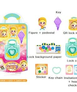 Componentes: Figura + pedestal, llave, medalla de QR lock, papel de fondo de lock, cubo de lock, calcomanía, llavero, tarjeta de invitación + chequeo de salud. Tamaño: 13.9 x 6.2 x 24.4 cm. Edad de uso: 3 años o más. Material: ABS y otros materiales.