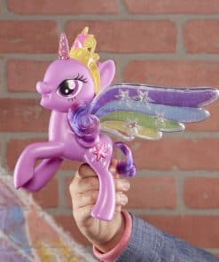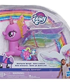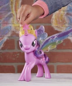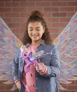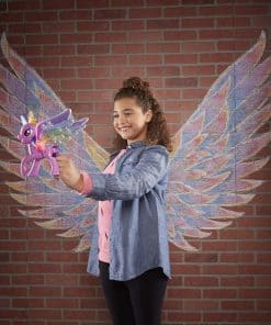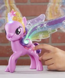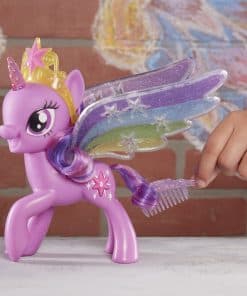 Twilight Sparkle representa el Elemento de la Armonía magia, y ella es una princesa alicornio, que es un pony que tiene tanto alas como cuerno de unicornio. ¡Imagínala volando a través de las nubes sobre Equestria con la figura de pony Twilight Sparkle con alas arcoíris! Esta figura de pony morado de 8 pulgadas tiene unas hermosas alas arcoíris inspiradas en escenas de entretenimiento. Presiona su distintiva marca de cutie de estrellas rosadas y blancas para ver cómo su cuerno de unicornio y alas se iluminan. Sus alas arcoíris también se agitan mientras la sostienes y guías hacia arriba y hacia abajo para fingir que está volando. ¡Cuando sus alas se agitan, también se iluminan! También viene con su tiara de princesa distintiva y un peine para cepillar y peinar su melena y cola moradas de raíces.