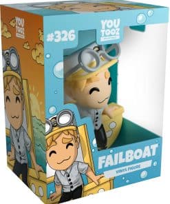 Failboat mide 5 pulgadas de altura, feliz como siempre para navegar por los mares. Su atuendo es una camisa gris claro con un patrón repetido de anclas con pantalones de capitán azul marino oscuro. Su vestimenta se completa con un sombrero de capitán y un par de gafas que descansan suavemente encima. Se le ve descansando en la parte superior de un velero amarillo con una vela blanca, decorada con una cara sonriente blanca en la parte inferior izquierda. Failboat está listo para golpear las aguas! El exterior de su embalaje de doble pared está dibujado a medida para mostrar las hermosas vistas a través de los mares a lo largo del día, incluyendo la mañana, la tarde y la noche. El embalaje interior muestra el canal de creación Mii, pero con un toque de YouTooz. La funda protectora muestra un entorno subacuático con burbujas surgiendo hacia arriba mientras un ancla blanca desciende.