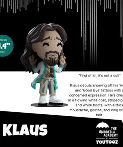 Con una altura de 4.4 pulgadas, esta figura de vinilo de Klaus muestra sus tatuajes ‘Hello’ y ‘Good Bye’ en las palmas de las manos, con una expresión de preocupación en el rostro. Su rostro tiene un grueso bigote sobre la boca y una larga perilla que cuelga frente a un pecho desnudo y un estómago tatuado. El cabello marrón fluye hasta los hombros, viste un abrigo blanco abierto con ribetes verdes pálidos, pantalones a rayas gris y beige y botas blancas. La envoltura exterior de su empaque muestra un Klaus ligeramente abrumado siendo alabado por su ‘no es una secta’. Mientras que el interior de su empaque es negro intenso cubierto de balas volando, cuchillos, paraguas y miras que continúa en la manga protectora donde su figura se puede ver a través de la ventana clara en la parte frontal del empaque. Esta figura coleccionable se envía en una manga exterior mate con relieve y un protector de plástico personalizado para protegerlo durante el envío.