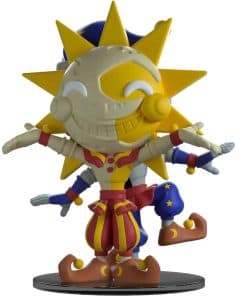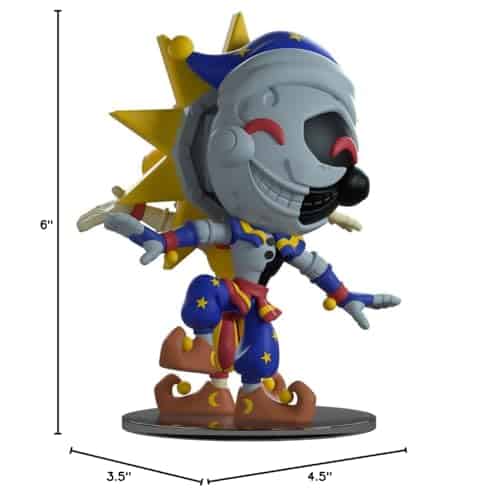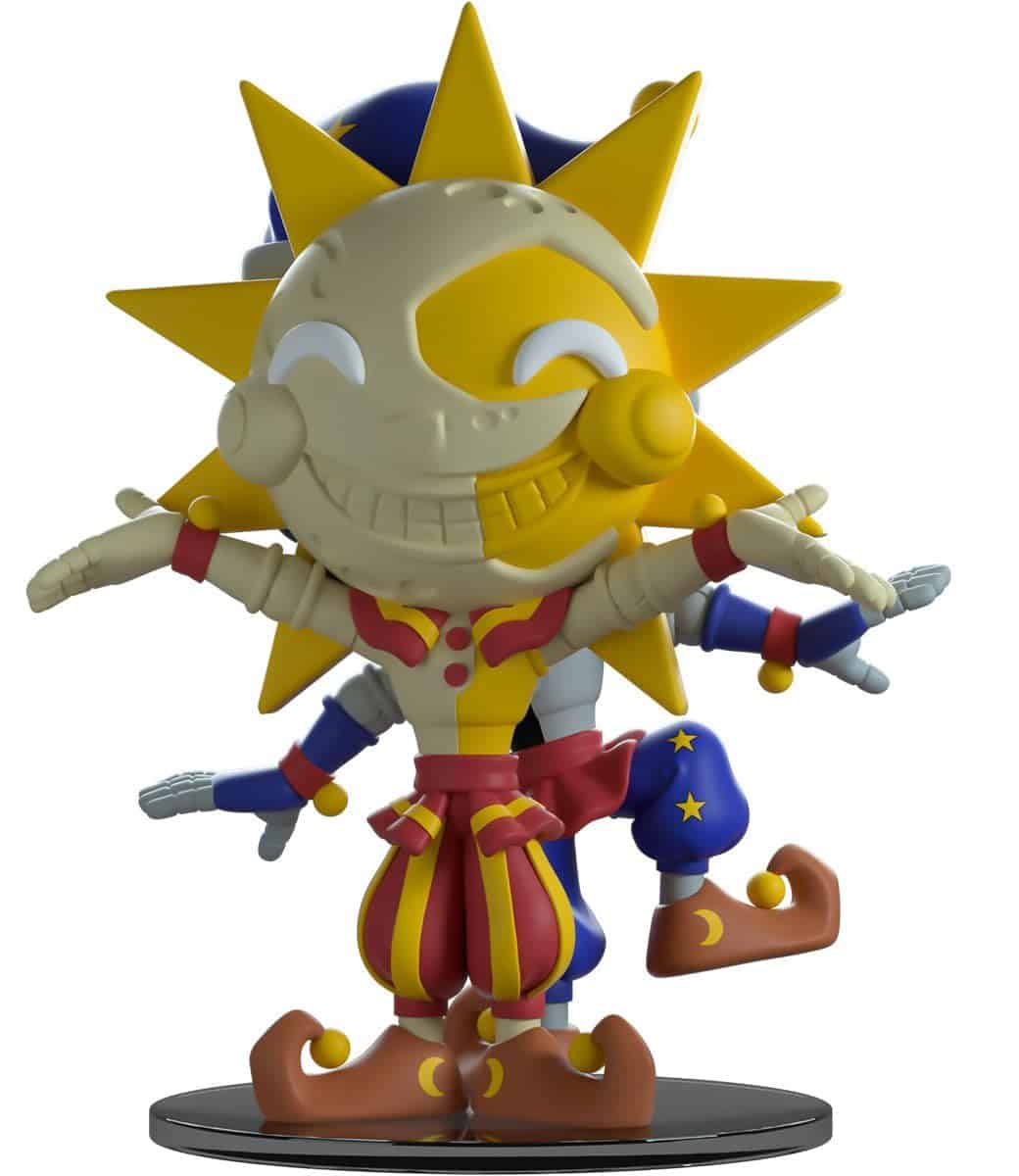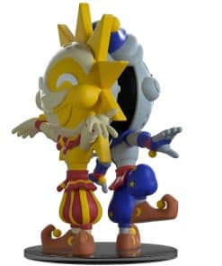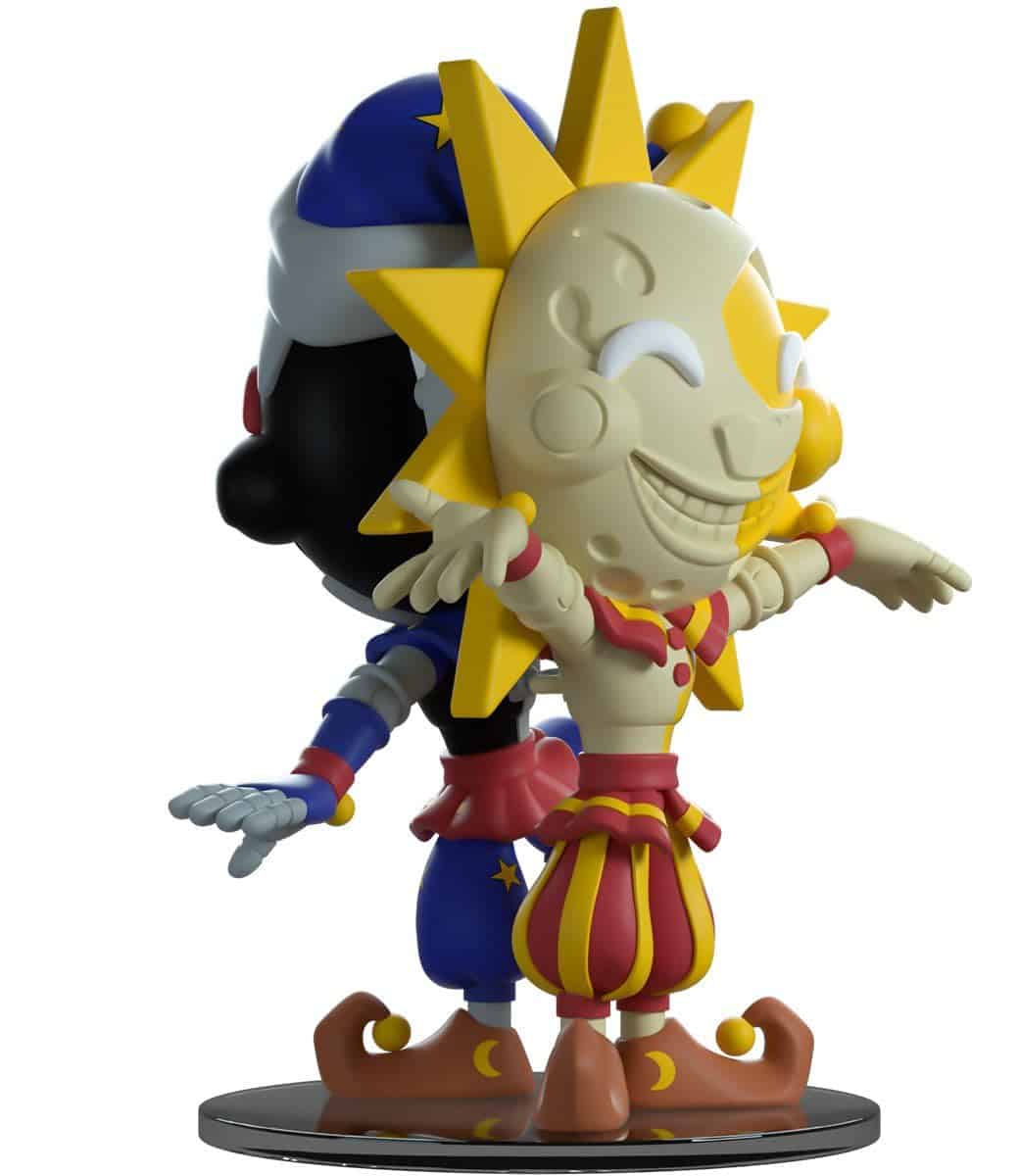 ¡Hola nuevo amigo! ¿Cuál conseguirás hoy? ¿Has sido bueno o malo? De 5.2 pulgadas de alto con el Sol en un lado, con los brazos abiertos dando la bienvenida y la Luna en el otro con una pierna levantada haciendo un bailecito travieso, las personalidades del cuidador del jardín de infantes están conectadas de espaldas. La cara sonriente del Sol es de un crema claro sobre amarillo y está rodeada de grandes púas amarillas, mientras que la de la Luna es un perfecto contraste de gris claro y negro y lleva un sombrero azul y amarillo. Coloreados en rojo y amarillo con rayas gruesas o azul y amarillo con estrellas brillantes, van vestidos con cuellos a rayas, camisas bicolor y guantes largos. Sus faldones fruncidos por encima de pantalones hinchados que se estrechan en los extremos, mientras que calzan zapatos marrones que se enroscan hacia atrás y están rematados con bolas amarillas. El exterior de su empaque muestra un castillo de color marrón claro con una cúspide roja y cortinas rodeado de nubes, sol y luna contra un fondo azul y estrellado. Mientras que el interior muestra un monitor de seguridad configurado que muestra a Freddy, Chica, Monty y Roxy a través de las pantallas mientras Sol y Luna se alzan en la oscuridad a su lado.