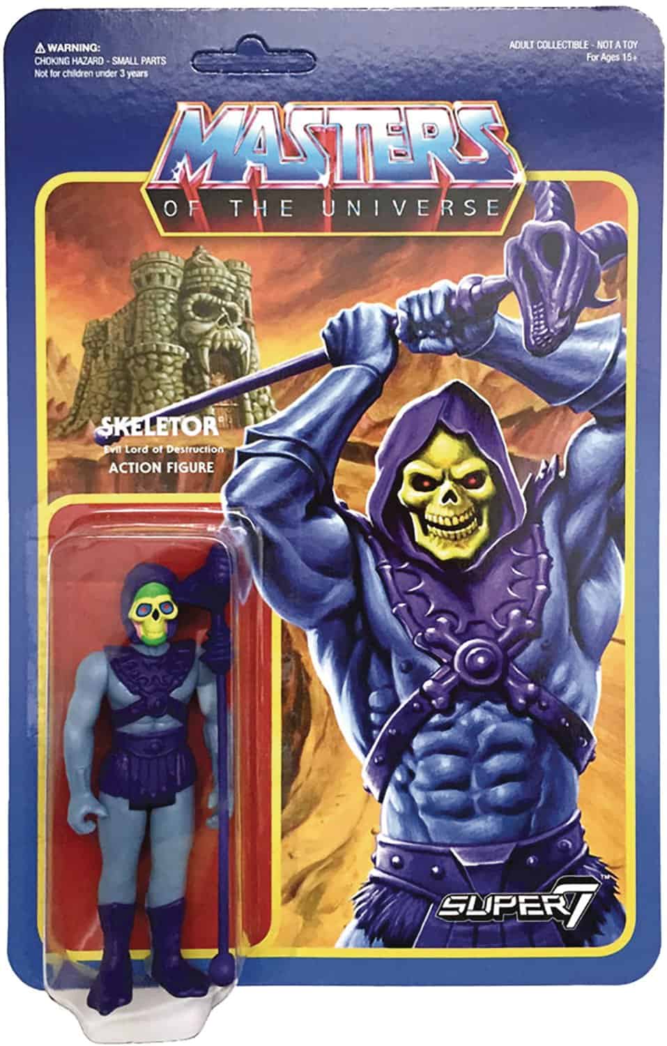 De Super 7. Los icónicos juguetes de Masters of the Universe reimaginados como figuras de acción de 3.75″ de la era dorada. Tri Klops, Trap Jaw, He-Man (versión Wave 2), Skeletor (versión Wave 2), Man At Arms y Sorceress disponibles como una figura de acción retro a todo color con cinco puntos de articulación y accesorios. Todos vienen empaquetados en una tarjeta de blister auténtica de la época con arte nuevo de la marca Jason Edmiston.