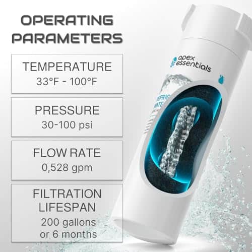 5. Parámetros de Operación: Temperatura 33 F – 100 F. Presión: 30-100 psi. Tasa de Flujo: 0,528 gpm. Vida Útil de Filtración: 200 galones o 6 meses.