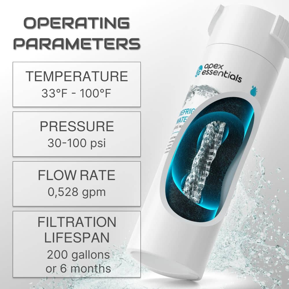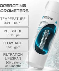 5. Parámetros de Operación: Temperatura 33 F – 100 F. Presión: 30-100 psi. Tasa de Flujo: 0,528 gpm. Vida útil de la Filtración: 200 galones o 6 meses.