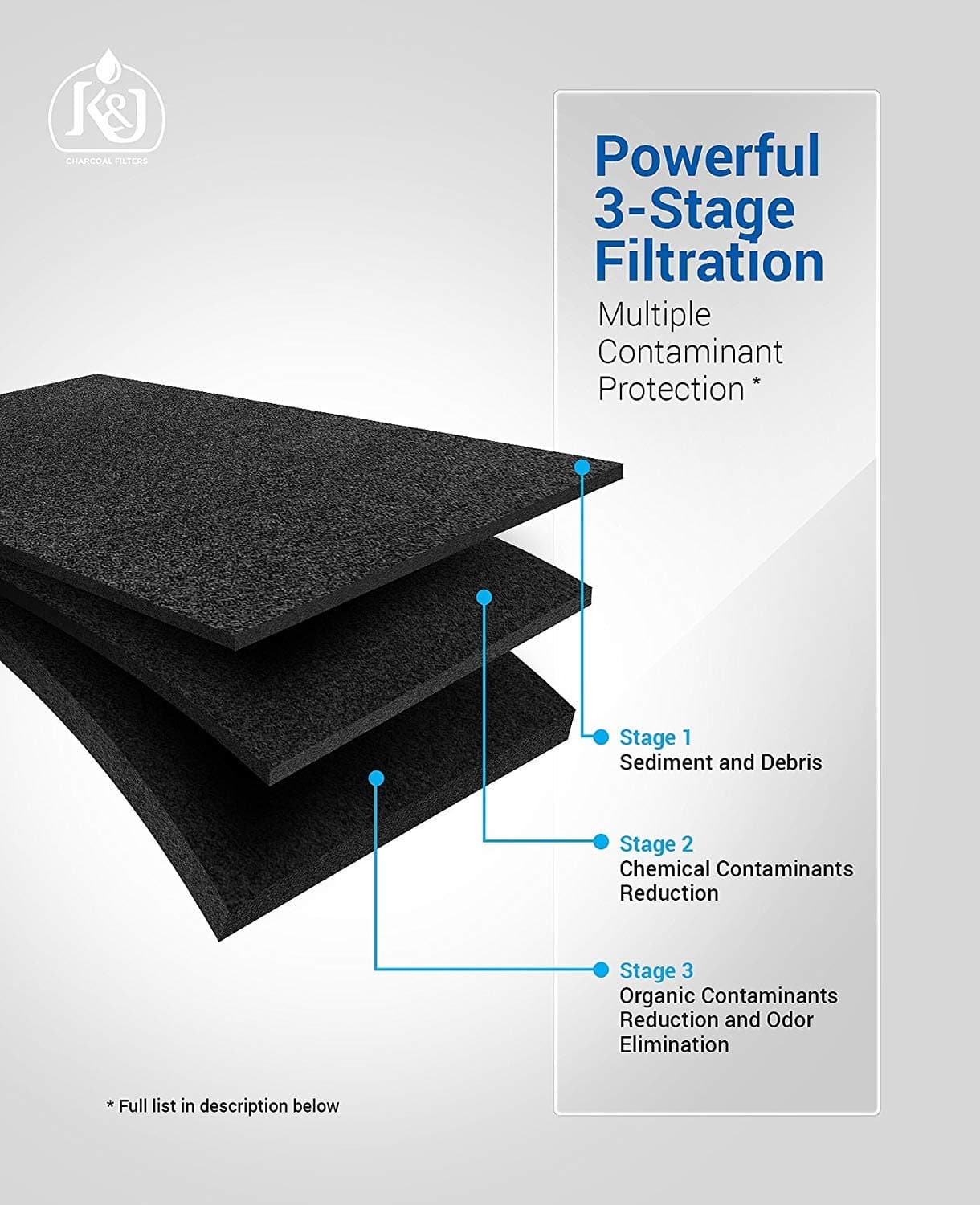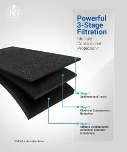 2. Tasa Máxima de Retención – K&J garantiza el más alto estándar de retención de material, incluyendo la filtración del 99.99% de cloro y sedimento. Certificado NSF 42 y 372.