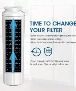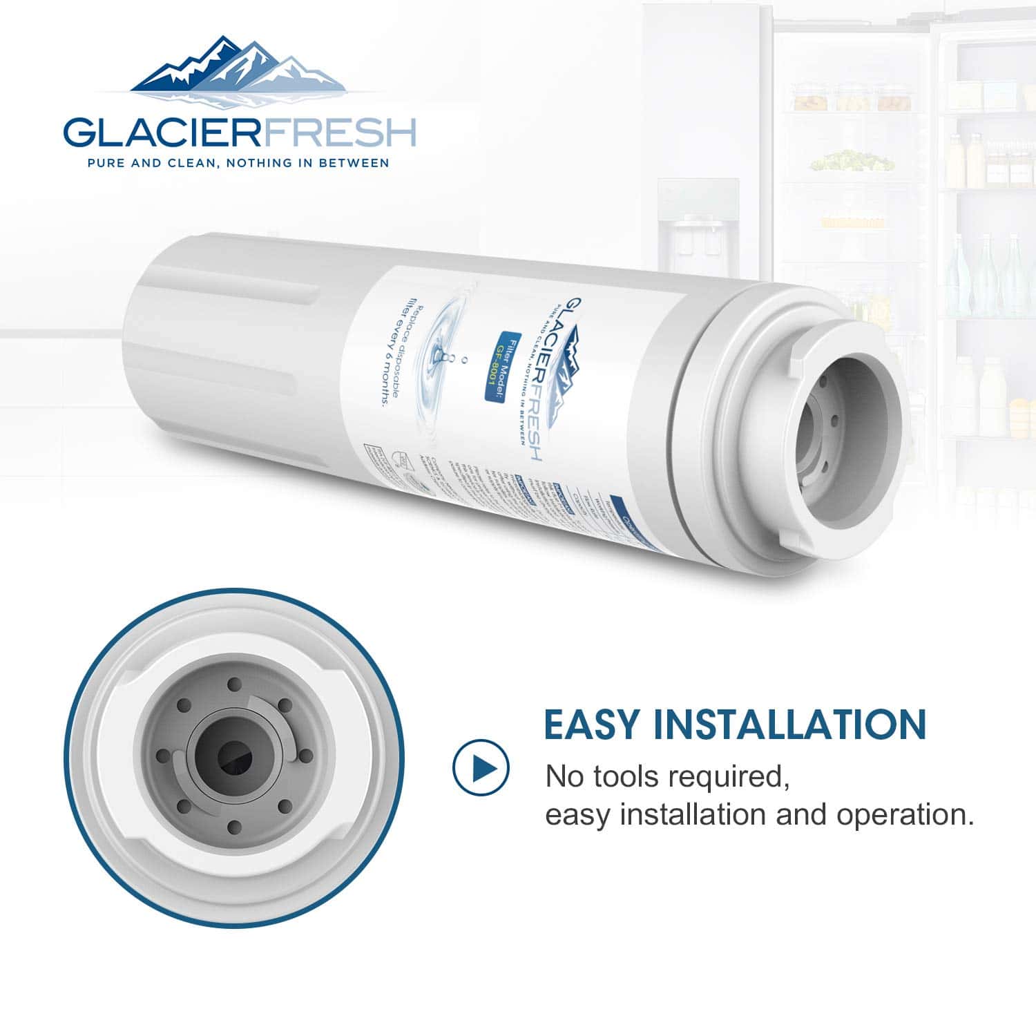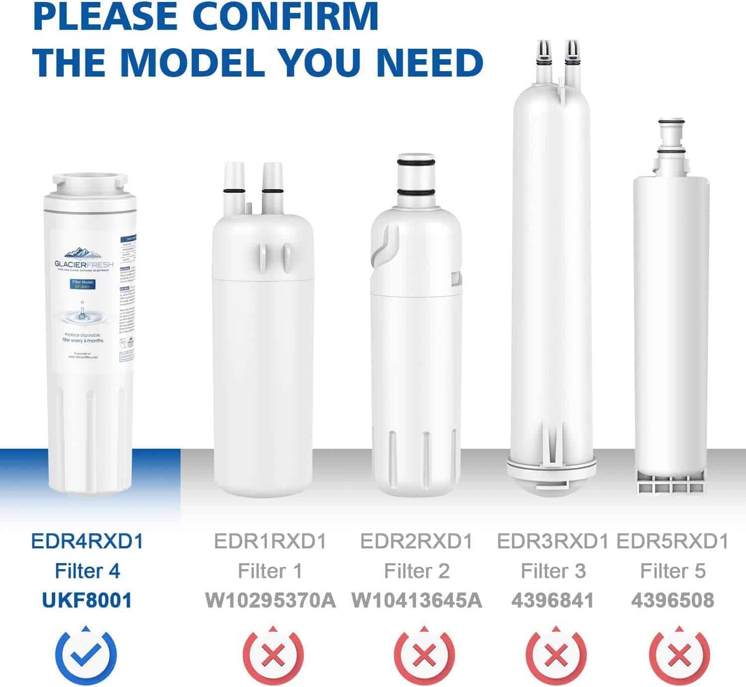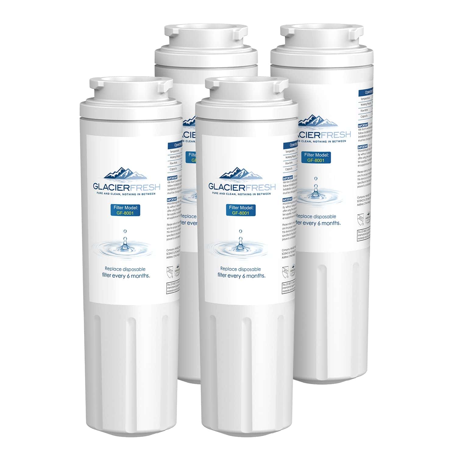 Filtro de agua GLACIER FRESH GF-8001 compatible con Whirlpool Refrigerator Water Filter 4 y otros modelos. Cuenta con material de certificación NSF42 que elimina el 97.9% de cloro y mejora el sabor del agua. Instalación fácil, perfecto ajuste y stickers para recordar el cambio cada 6 meses.
