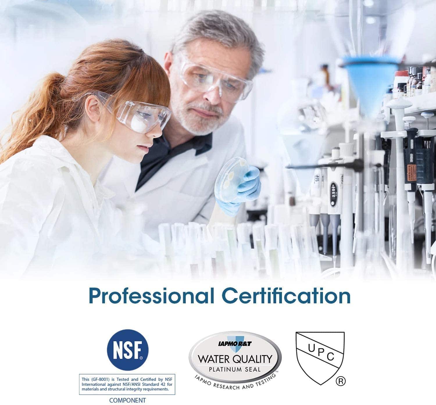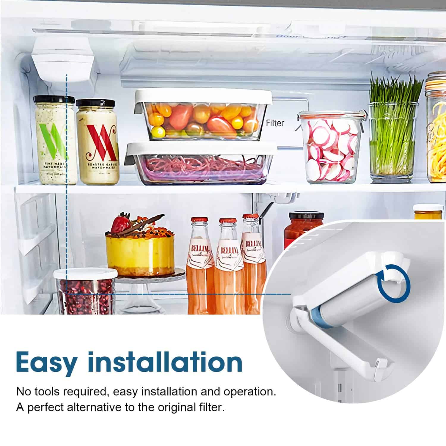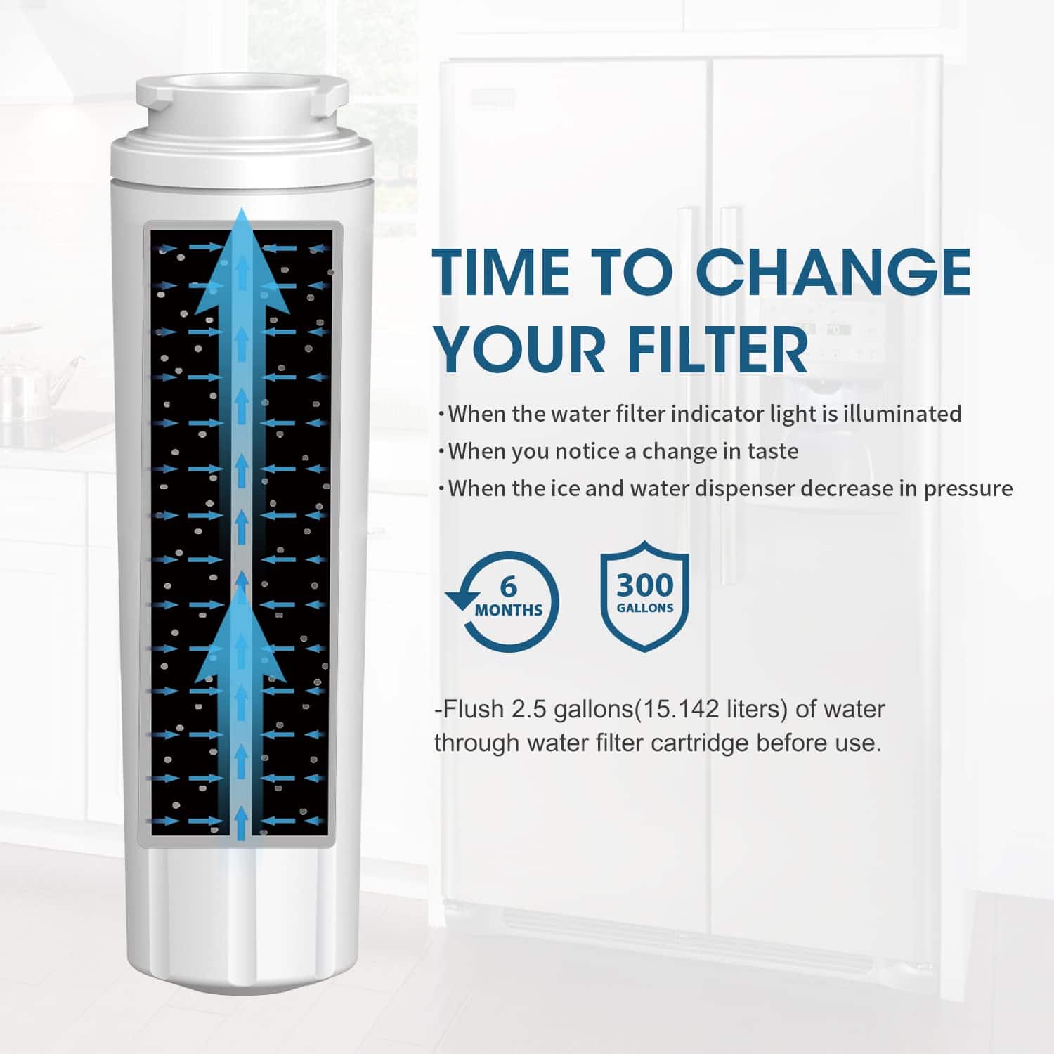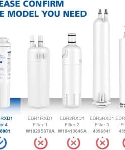 Filtro de agua GLACIER FRESH GF-8001 compatible con Whirlpool Refrigerator Water Filter 4 y otros modelos. Cuenta con material de certificación NSF42 que elimina el 97.9% de cloro y mejora el sabor del agua. Instalación fácil, perfecto ajuste y stickers para recordar el cambio cada 6 meses.