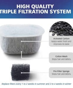 Filtro de repuesto PETSTANDARD compatible con la fuente de agua WOPET 67oz/2L & 118oz/3.5L; W300, W300B, W500. Estos son filtros de marca PET STANDARD y no son creados ni vendidos por WOPET. Paquete de 10 filtros y 4 esponjas de prefiltro de repuesto. Medidas del filtro: 2.5″ x 1.5″ x 1.25″. Sistema de triple filtración de calidad premium: compuesto por una capa de algodón, un prefiltro de carbón y carbón activado. Filtra eficazmente el pelo, metales pesados, mantiene el agua fresca y mejora el sabor del agua. Para evitar que el polvo de carbón activado se desprenda en el agua, por favor remoje el filtro de la fuente para gatos en agua durante 2 minutos y enjuague completamente bajo agua corriente antes de usarlo. Cambie cada 2 semanas para mantener el agua fresca y pura. ¡Cambiar el filtro cada semana será más saludable! Por favor, no dude en contactarnos si tiene alguna pregunta sobre nuestros productos, ¡nos gustaría ayudarle!