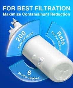2. Rendimiento constante, diseño a prueba de fugas: Probado para durabilidad con una presión de explosión de 400 PSI y 100,000 ciclos de martillo de agua, este filtro de reemplazo garantiza un rendimiento consistente y fiable. El anillo de sellado superior está diseñado para evitar fugas durante el uso. Cada filtro está optimizado para 6 meses o 200 galones de agua limpia para proporcionar la máxima filtración antes del reemplazo.
