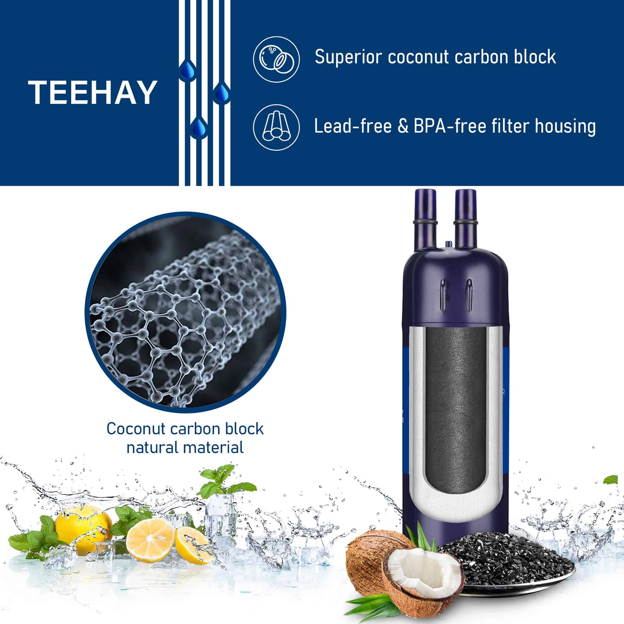 4. Material Premium – Hecho de bloque de carbono de cáscara de coco seleccionado. Materiales de carcasa de filtro libres de plomo, libres de BPA y de grado alimenticio.
