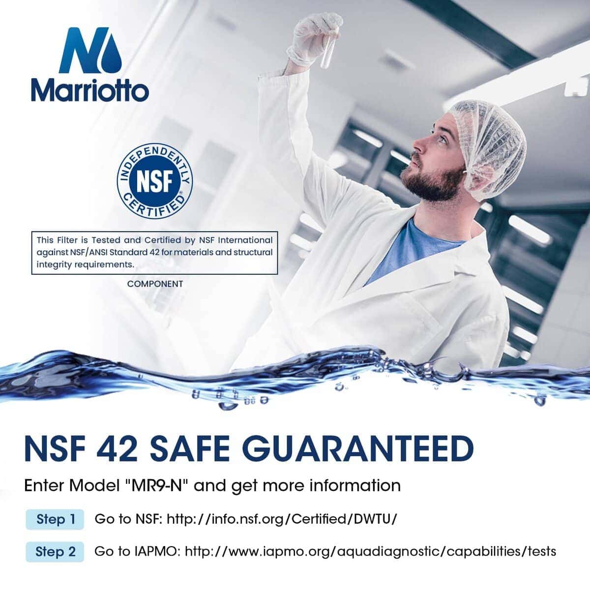 2. NSF/ANSI 42: Probado por nuestro laboratorio independiente, este producto es efectivo para reducir en un 97.9% cloro, olor y malos sabores en el agua. Vaya a la base de datos de la NSF e ingrese el número de modelo certificado MR9-N para obtener más información de la NSF sobre este producto.