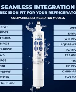 Nuestro filtro de agua Mist de repuesto está meticulosamente diseñado para brindar agua excepcionalmente pura. Diseñado expertamente para reducir el 99% de cloro, metales pesados y otras impurezas, mejorando significativamente el sabor del agua potable, manteniendo al mismo tiempo minerales beneficiosos para el cuerpo humano. Este reemplazo de filtro de agua para refrigerador de GE RPWF es compatible con: RWF1063, RWF3600A, WSG-4, DWF-36, R-3600, MPF15350, OPFG3-RF300, BCF77. Por favor, ten en cuenta: ¡Este reemplazo NO es compatible con RPWFE! La excelencia es el pilar de nuestra marca, reflejada en nuestro filtro de carbón activado certificado por la NSF. Certificado por NSF International para la salud y la seguridad, nuestro filtro cumple con el estándar 42 de la NSF/ANSI para la pureza del agua y la integridad sin plomo. Compatible con los siguientes refrigeradores: CFE28TSH, CWE23SS, CYE22TSH, CYE23TSD, GFE26GGH, GFE26GMH, GFE26GSH, GFE29HSD, GNE26GSD, GFE28HSH, GFE28HGH, GFE28HMH, GNE29GGH, GNE29GMH, GNE29GSH, GYE22KMH, GYE22KSH, PYE22PS, PYE23KSD, PYE23PSD, PFE27KSD, PFE28RSH, PFE29PSD, PWE23KGD, PWE23KMD, PWE23KSD, ZWE23NST, ZWE23PSN, ZWE23PSH, ZWE23ESH, ZWE23ESN. Disfruta de 6 meses o 300 galones de agua pura con nuestro filtro de refrigerador que promete un rendimiento duradero y sin fugas. Diseñado para la conveniencia del usuario, este filtro de agua RPWF para refrigeradores ofrece un proceso de instalación simple y sin herramientas. Este filtro para refrigerador incluye una pegatina de instalación mensual para llevar un registro de cuándo es necesario reemplazar tu filtro.
