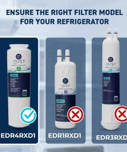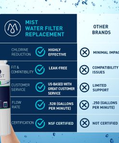 Nuestro filtro de agua de repuesto Mist UKF8001 Filter 4 ha sido meticulosamente diseñado para proporcionar agua excepcionalmente pura. Expertamente diseñado para reducir el 99% de cloro, metales pesados y otras impurezas, mejorando significativamente el sabor del agua potable, mientras mantiene minerales beneficiosos para el cuerpo humano. Este filtro de agua de nevera es compatible con varios modelos de Whirlpool, Maytag, Kenmore, KitchenAid, Jenn-Air, Maytag, Pur y Amana. Certificado por la NSF International y por IAPMO R&T, cumple con las normas 42 y 372 de NSF/ANSI para pureza del agua e integridad libre de plomo. Disfrute de 6 meses o 300 galones de agua pura con este filtro de nevera que promete un rendimiento duradero y libre de filtraciones. La instalación es sencilla y no requiere herramientas, además, incluye pegatinas de instalación mensuales para llevar un control de cuándo debe reemplazar su filtro.