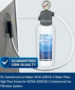 El filtro de agua para fabricador de hielo PERCOLA HF40-S/HF45-S es el cartucho de reemplazo perfecto para mantener su Sistema de Filtración de Agua para Fabricador de Hielo Comercial ICE140-S/ICE145-S funcionando de manera óptima. Con una capacidad de hasta 25,000 galones, este filtro garantiza un rendimiento eficiente y una calidad de agua superior.