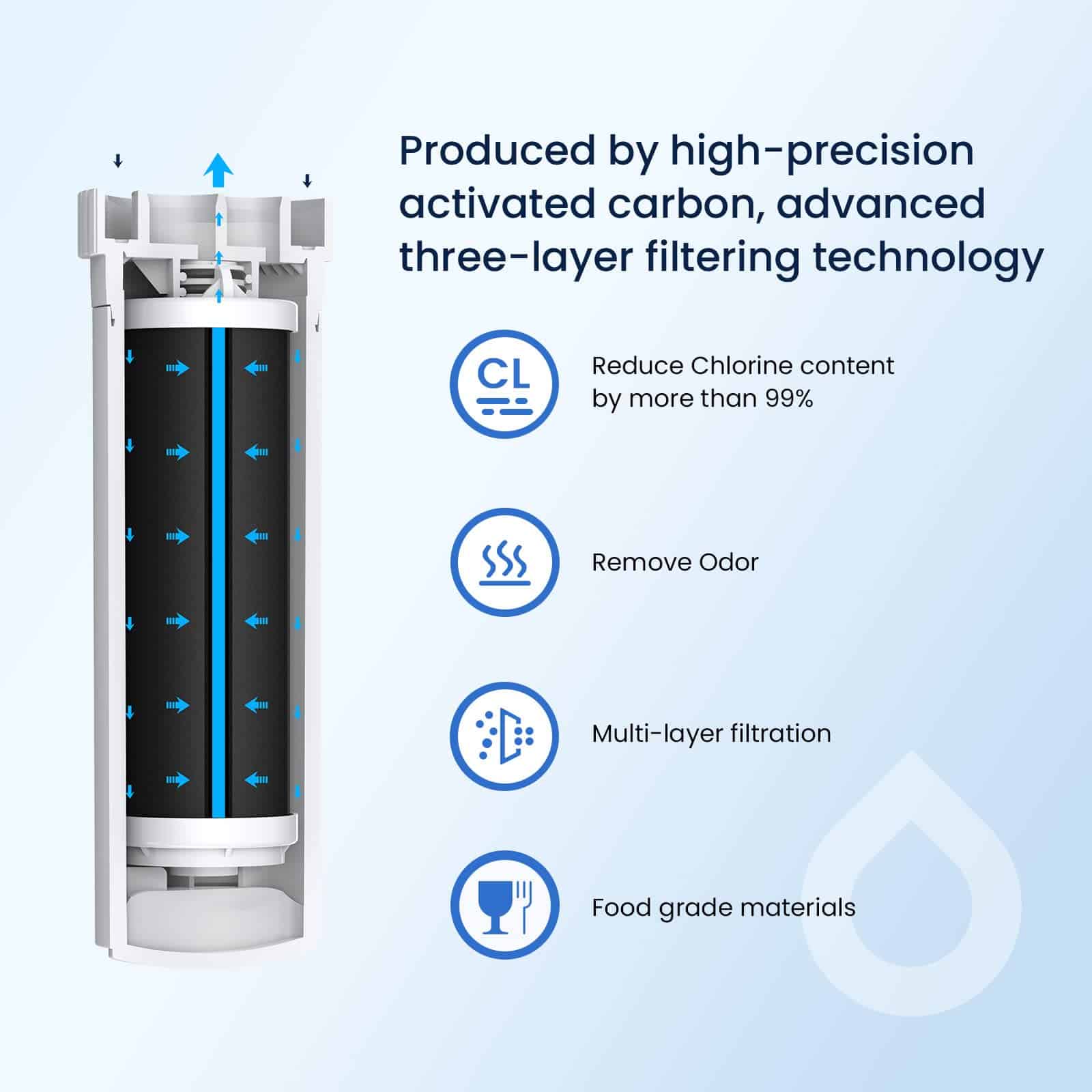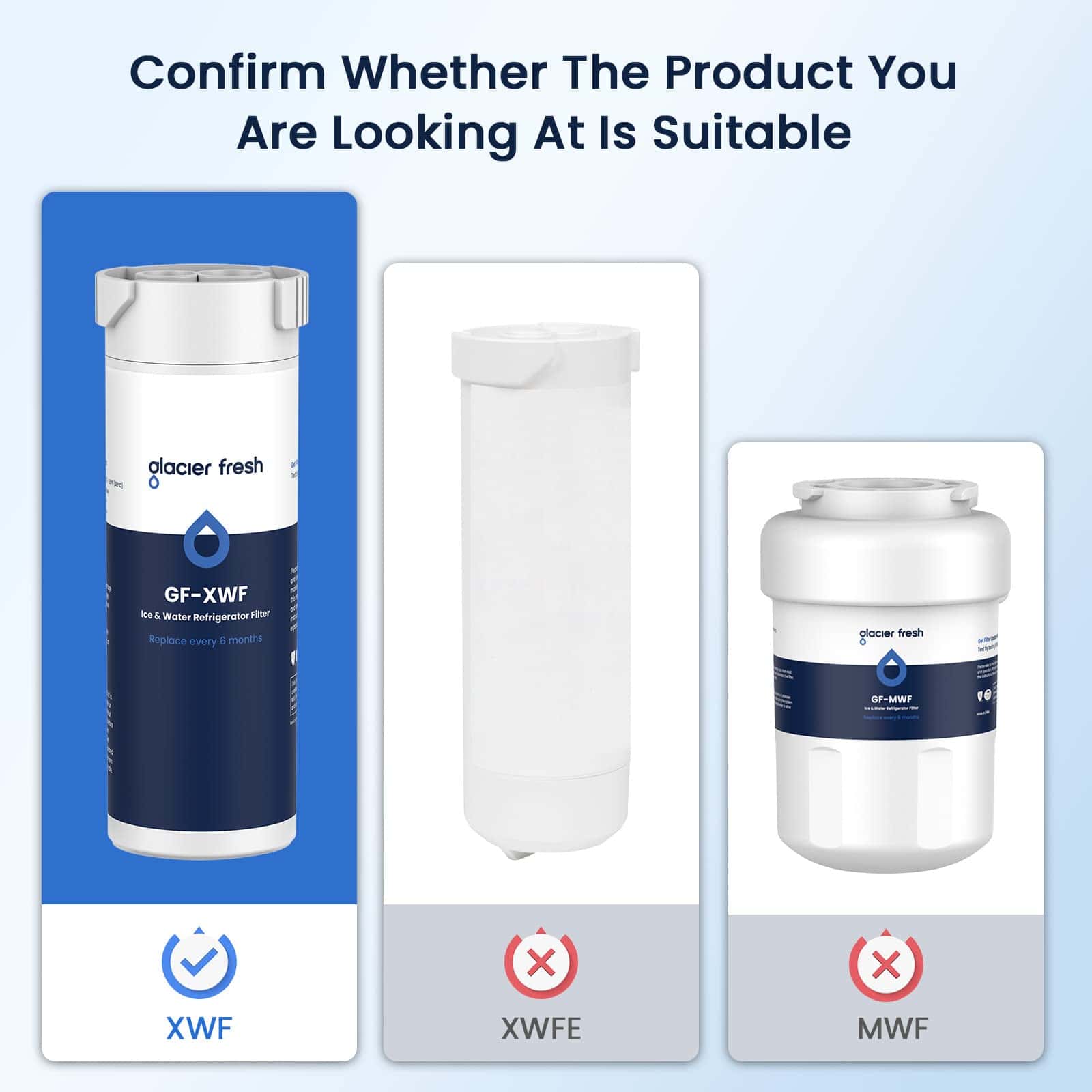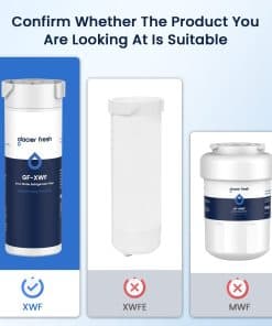 Visión general del Filtro de Agua para Refrigerador de Reemplazo GLACIER FRESH GE XWF: GLACIER FRESH se compromete al desarrollo y producción de filtros de refrigerador. Proporcionándole a usted y a sus seres queridos agua potable más limpia, más saludable y de mejor sabor en casa. Filtro de Agua para Refrigerador XWF NSF 42 Certificado de Reemplazo GLACIER FRESH: NSF International es una organización independiente y sin fines de lucro que examina productos de consumo para garantizar que cumplan con estrictos estándares de certificación. Compatible con los modelos de filtro de agua de refrigerador GE XWF, WR17X30702, GBE21, GDE21, GDE25, GFE24, GFE26, GNE21, GNE25, GNE27, GWE19, GYE18, QNE27, GSE25, GSS23, GSS25, GZS22, PSE25, CZS22, etc. Adecuado para 2 tipos de Refrigerador: 1. Refrigerador de lado a lado: Alinee las flechas en el filtro y el soporte del cartucho del filtro y empuje suavemente el filtro hacia arriba dentro del soporte. Gire lentamente el filtro hacia la derecha hasta que se detenga. 2. Refrigerador con congelador inferior: Alinee los puertos en el filtro como muestra la imagen e inserte suavemente el filtro. Luego gire lentamente el filtro hacia la derecha hasta que las flechas se alineen.
