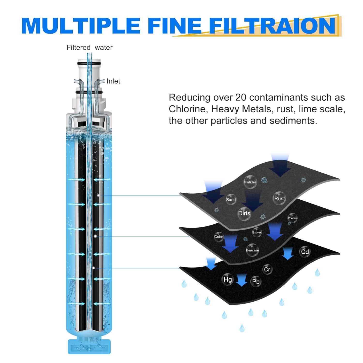 2. – Utilizando tecnología de filtración de múltiples etapas y bloque de carbono de cáscara de coco de alta calidad que ayuda a eliminar Cloro, THM, VOCs, cadmio, cromo, cobre y todas las demás impurezas principales para una filtración efectiva del agua. GOLDED ICEPURE es un experto en diseño de retener minerales beneficiosos para el cuerpo humano.