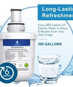 Filtro de Agua para Refrigerador SAFWAT RAS00WFAAAA/DA. Este filtro de agua para refrigerador RAS00WFAAAA reduce el sabor, olor a cloro y óxido, sin eliminar minerales que pueden ser beneficiosos para la salud, como el fluoruro. Proporciona agua limpia, clara que se ve y sabe genial. Protege los componentes de tu refrigerador de posibles sedimentos y mejora la calidad de toda el agua que ingresa al electrodoméstico. Tiene una vida útil prolongada de hasta 6 meses o 300 galones, dependiendo de las condiciones del agua, lo que ocurra primero.