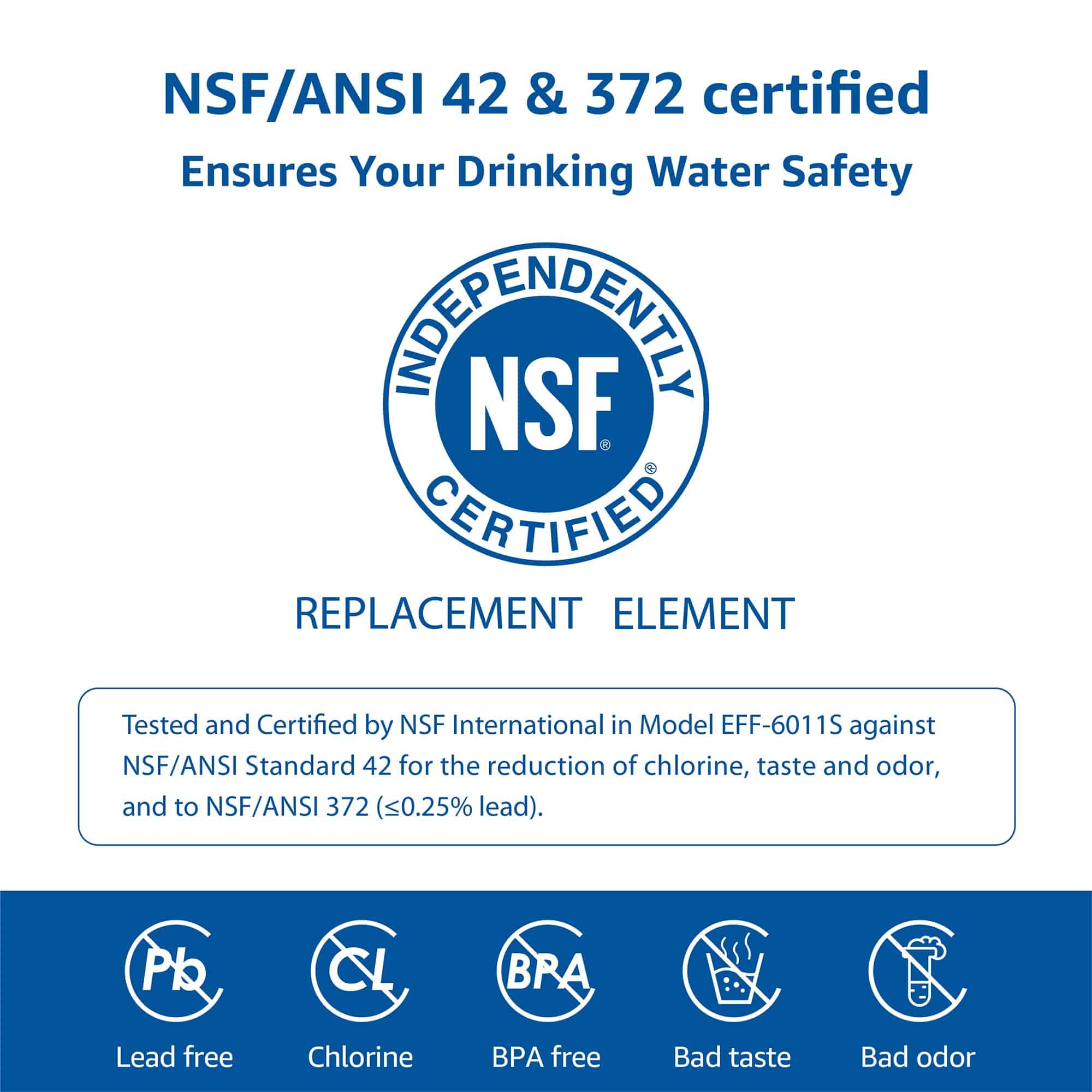 The Waterspecialist refrigerator water filter offers great filtration performance to reduce harmful substances in water such as chlorine, taste, and odor. This has been tested and proven by an independent third-party laboratory. The filter is certified by NSF 42 and 372 for quality assurance.