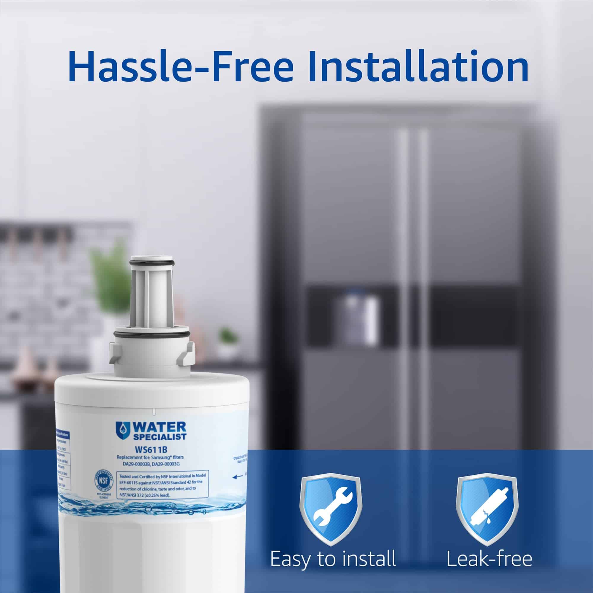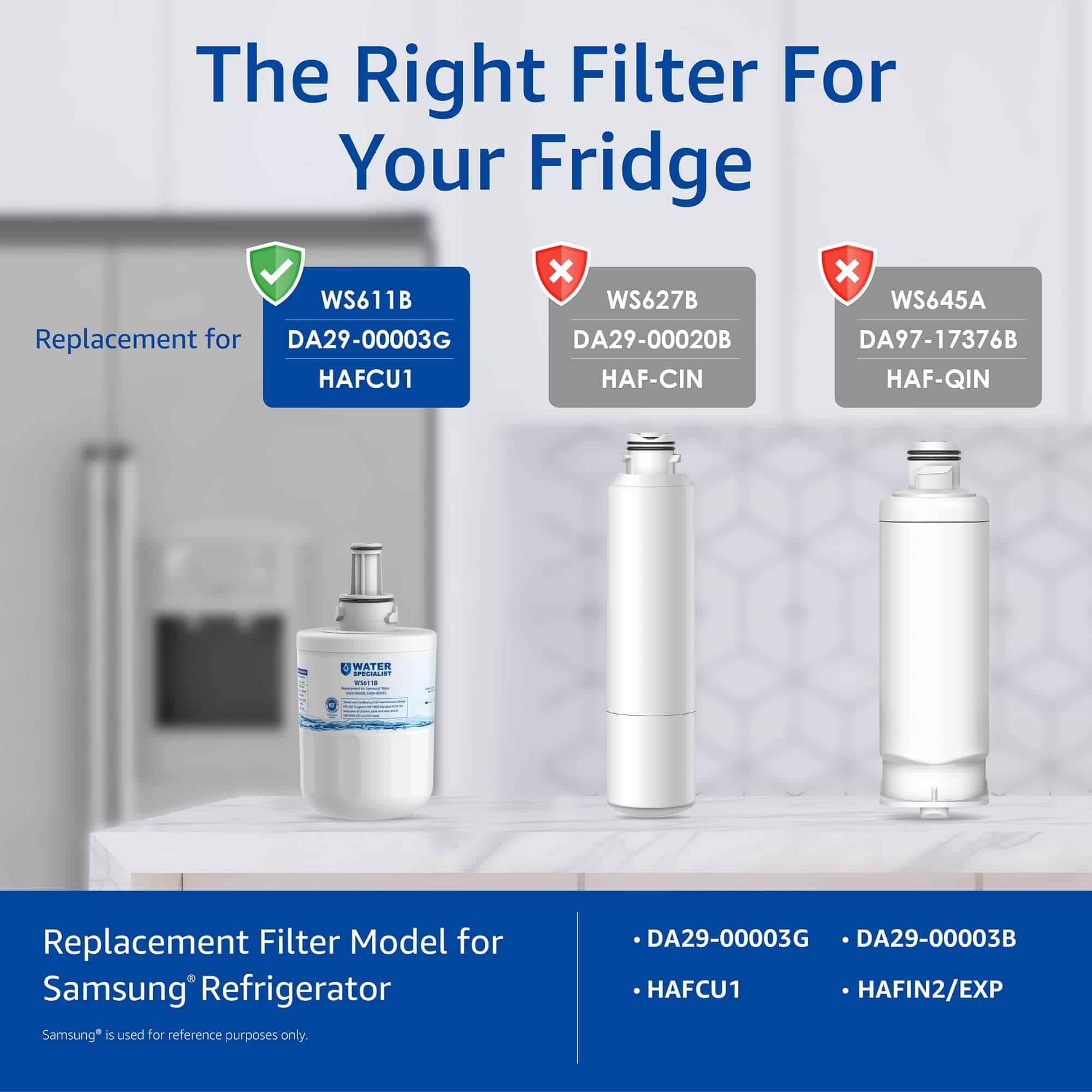 Replace your refrigerator water filter with Waterspecialist DA29-00003G to enjoy fresh and clean water. This filter is a perfect replacement for multiple models including DA29-00003G, Aqua-Pure Plus, DA29-00003A, DA97-06317A, RF267AERS, HAFIN2, FMS-1, RF268ABRS, DA61-00159, DA29-00003D, HAFCU1/XAA, HAFIN2/EXP, DA29-00003, DA29-00003A-B, DA61-00159A, DA61-00159A-B, DA61-159, AP4444333. It is also compatible with WF-DA29-00003G, RWF1010, RWF1100A, GF-03G, PL-700, CWMF022, EFF-6011A, AQF-FF11B, WD-F11B, FL-RF11, MB-F11B, WF289, CLCH103 models.