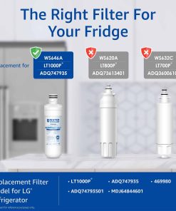 El filtro para refrigerador Waterspecialist ofrece un rendimiento de filtración comparable a la marca original. Certificado por NSF 42 y 372, solo utiliza carbón de cáscara de coco superior para mejorar sabor y olor. Reduce metales pesados, mercurio, cloro, THM, VOCs, entre otros. El filtro de aire mantiene los olores alejados de los alimentos, manteniendo el aire fresco en el refrigerador. Fabricado con material de filtro premium, combinando precisión y diseño ingenioso para ofrecer un ajuste perfecto y evitar problemas de filtración. Libres de BPA y certificados como libres de plomo. Incluye etiquetas de instalación mensuales y se recomienda el cambio cada 6 meses o 200 galones. Reemplazo compatible con modelos de LG, Kenmore y filtros de aire LG LT120F.