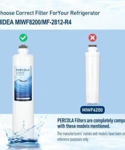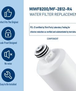 El Filtro de Agua PERCOLA MIWF8200 es compatible con los modelos de refrigeradores Midea MIWF8200/MF-2812-R4 y MRF29D3AST, MRF29D6AST, incluyendo un paquete de 3 filtros para garantizar una filtración de alta calidad del agua potable. Con una capacidad de filtración a largo plazo, este filtro está diseñado para durar 6 meses o 200 galones, asegurando un suministro constante de agua limpia y fresca para toda la familia. Reduzca eficazmente el cloro, sabor, olor, partículas, turbidez y otras impurezas principales, mejorando significativamente el sabor del agua mientras mantiene los minerales beneficiosos. El proceso de reemplazo es sencillo y no requiere herramientas, lo que facilita el mantenimiento continuo del purificador de agua y la pureza del agua. Disfrute del agua potable fresca y limpia con el Filtro de Agua PERCOLA MIWF8200.