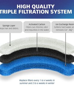 Compatible SOLO con fuentes de agua transparentes NPET WF050 para mascotas. Filtro en Forma de Arco: Lado más largo aproximadamente 4.50 pulgadas. Ancho aproximadamente 2.25 pulgadas. Grosor aproximadamente 0.75 pulgadas. Sistema de Triple Filtración: Compuesto por una Capa de Esponja, Capa de Carbón activado y una Capa de Resina de Intercambio de Iones. Efectivo para filtrar pelo, metales pesados, mantener el agua fresca y mejorar el sabor del agua. Para evitar que el polvo de carbón activado se desprenda en el agua, remoje el filtro de la fuente para gatos en agua durante 10 minutos y luego enjuague completamente bajo agua corriente antes de usar. De 1 a 4 semanas en verano y de 2 a 6 semanas en invierno. Si varios gatos usan la fuente, será necesario reemplazar más frecuentemente. Paquete de 12 filtros de fuente para mascotas de calidad premium, empaquetados individualmente y sellados para mantener la alta calidad. Suficiente suministro para 4 a 18 meses de uso. No dude en contactarnos si tiene alguna pregunta sobre nuestros productos, nos gustaría ayudarle!