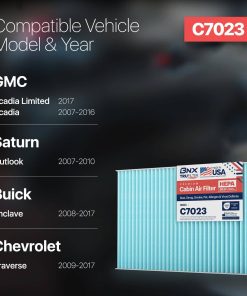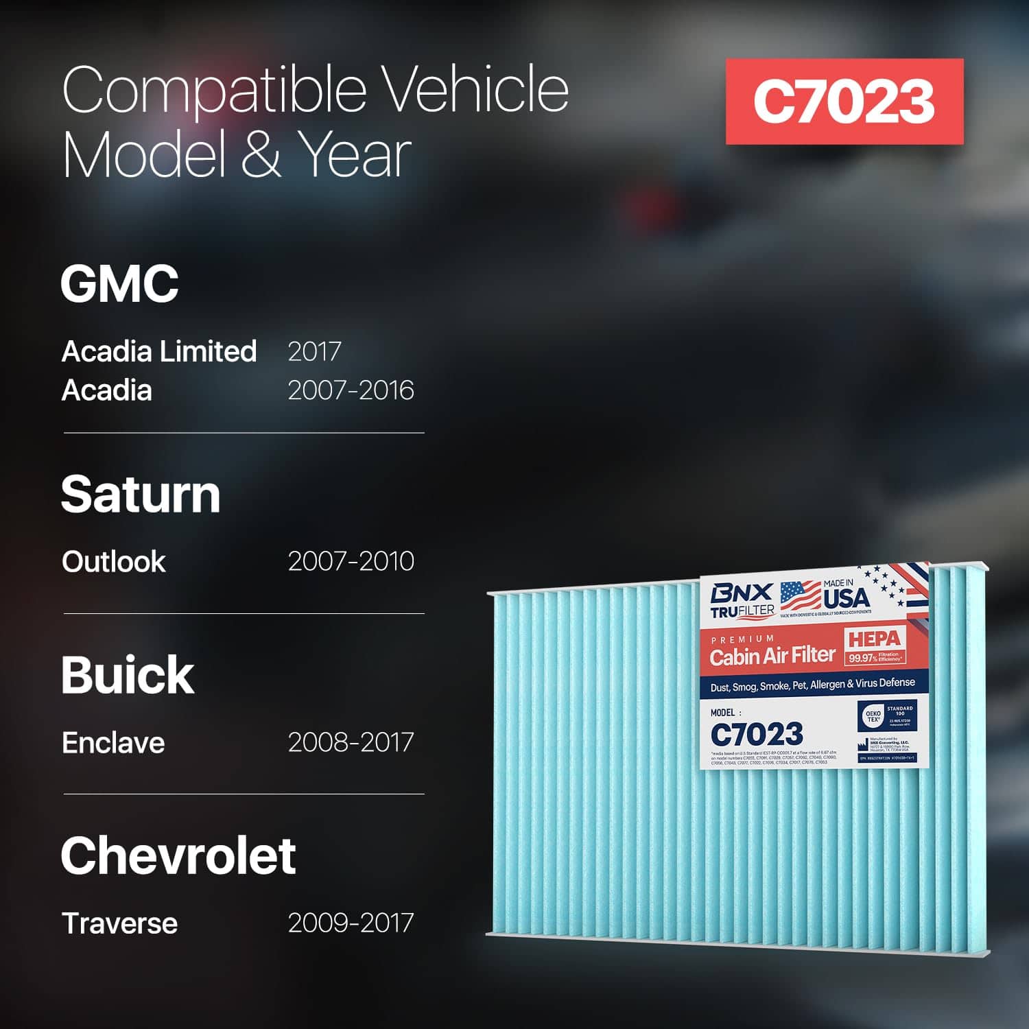 Este filtro de aire de cabina BNX TruFilter C7023 es la solución perfecta para mantener el aire de su automóvil limpio y fresco. Con una eficiencia de filtración del 99.97%, garantiza que el aire que respira dentro del vehículo esté libre de partículas dañinas. Compatible con GMC Acadia, Acadia Limited, Chevrolet Traverse, Saturn Outlook y Buick Enclave, este paquete de 4 filtros asegura una larga durabilidad y rendimiento óptimo. ¡Asegúrese de tener un aire limpio y saludable en su automóvil con BNX TruFilter!