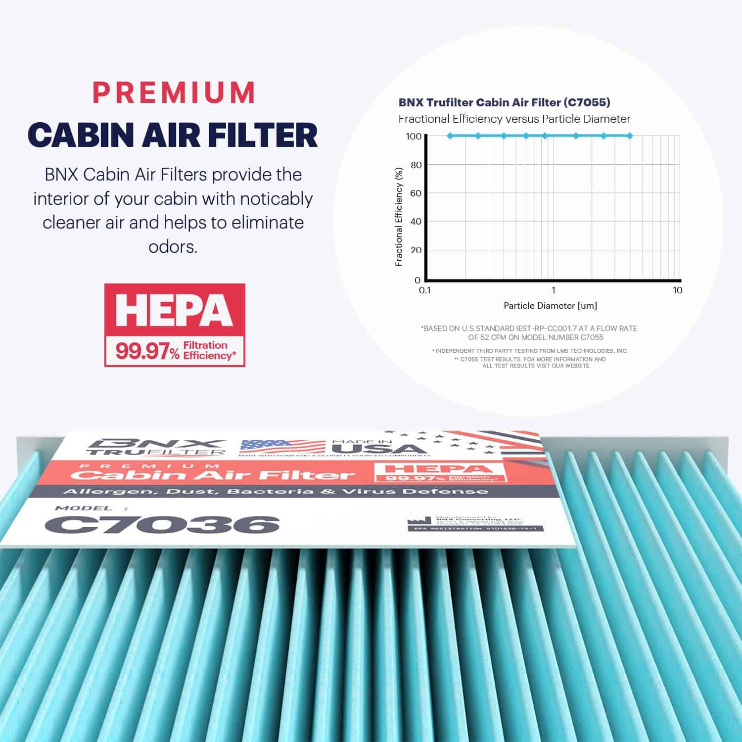 Filtro de aire de cabina BNX TruFilter C7036, HEPA 99.97%,
