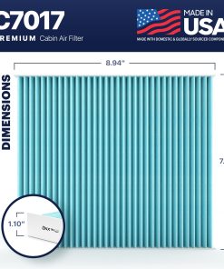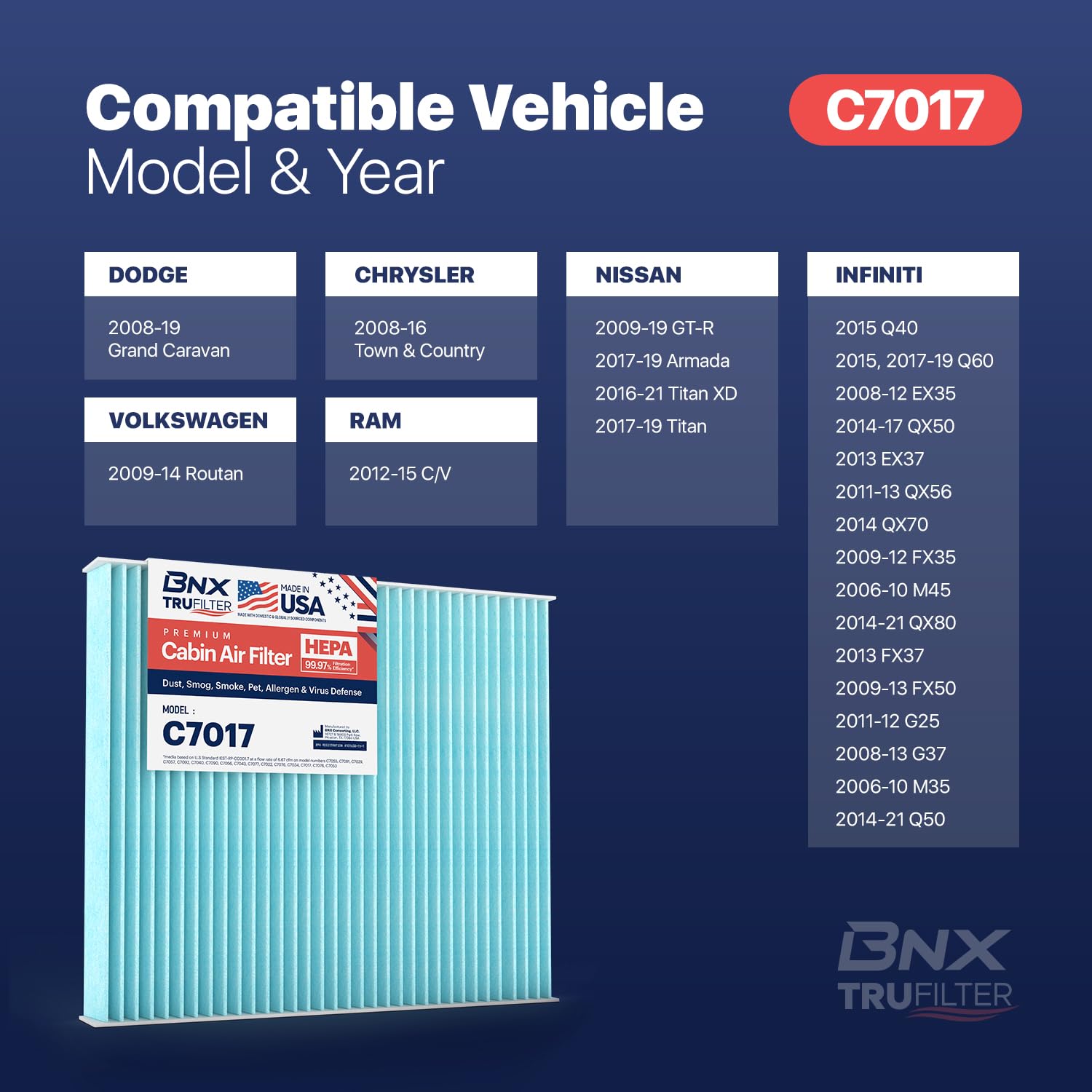 Filtro de aire de habitáculo BNX TruFilter C7017, HEPA 99,97%, compatible con selectos Infiniti EX, FX, G, M, Q, QX; compatible con Nissan Armada, GT-R, Titan; Ram C/V; Volkswagen Routan. Los filtros de aire de habitáculo BNX están diseñados utilizando un medio de filtración de fusión por soplado HEPA 99,97%, basado en el Estándar Estadounidense IEST-RP-CC001.7. Los filtros de habitáculo BNX premium se fabrican orgullosamente en los EE. UU. y lo protegen contra partículas microscópicas dañinas como el humo, la niebla, el moho, las bacterias, los alérgenos de mascotas y más. (Registro 101638-TX-1). Los filtros de aire de habitáculo HEPA de BNX proporcionan a su vehículo aire notablemente más limpio en 24 horas, lo que le permite respirar aire más limpio para usted y sus seres queridos. Para un rendimiento óptimo, los filtros de habitáculo de BNX deben sustituirse una vez al año o cada 12,000 millas. El medio filtrante HEPA filtra incluso las partículas más pequeñas con una eficiencia de filtración del 99,97% a 0,3 micrones. Compatible con Infiniti: FX35 2009-12, FX37 2013, FX50 2009-13, G25 2011-12, G37 2008-13, M35 2006-10, M45 2006-10, Q40 2015, Q50 2014-21, Q60 2015,2017-19, QX50 2014-17, QX56 2011-13, QX70 2014, QX80 2014-21; Compatible con Nissan: Armada 2017-19, GT-R 2009-19. Compatible con Nissan: Titan 2017-19, Titan XD 2016-21. Compatible con Chrysler: Town & Country 2008-16; Dodge: Grand Caravan 2008-19; Infiniti: EX35 2008-12, EX37 2013. TruFilter se compromete a ofrecer los productos de seguridad y filtración de más alta calidad fabricados en América, con trabajadores estadounidenses y utilizando los últimos procesos de fabricación automatizados y tecnología con los estándares de calidad más estrictos.