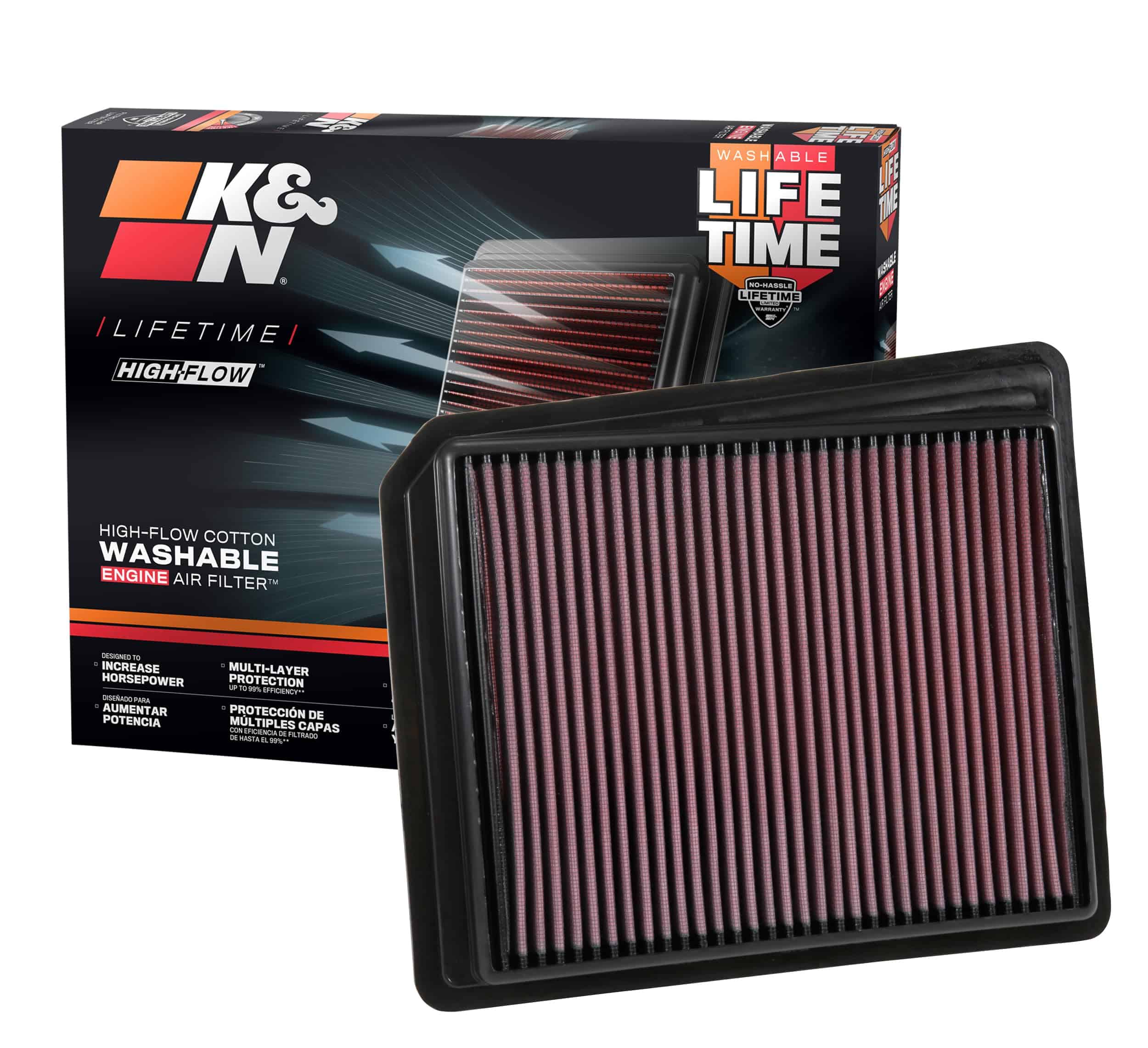 5. EL FILTRO REUTILIZABLE K&N TE AHORRA DINERO: Un filtro de aire lavable y reutilizable K&N te ahorrará hasta $125 vs. comprar múltiples filtros desechables (en comparación con el PVP en USD de los filtros OE correspondientes para 200,000 millas de conducción en carretera).