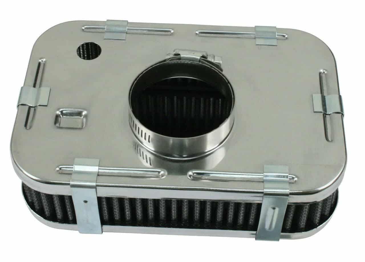 El filtro de aire rectangular se adapta a un carburador VW solex de stock con una entrada de 2-1/16 pulgadas. Viene con un elemento de gasa lavable, abrazadera cromada en la parte superior e inferior. SE ADAPTA A: Carburadores VW de Stock 28 30 31 32 Dimensiones largas: 6-3/4 pulgadas Dimensiones cortas: 4-1/2 pulgadas Altura: 2 pulgadas. Filtro de Aire Rectangular para Carburadores VW de Stock, Entrada de 2-1/16