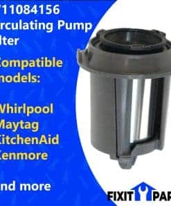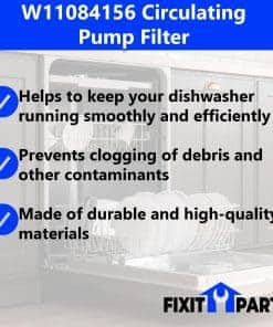 W10713298 previene que los desechos y otros contaminantes obstruyan la bomba circulante del lavavajillas. W11084156 es compatible con una variedad de modelos de lavavajillas, incluyendo Whirlpool, KitchenAid y Kenmore. Encuentre la compatibilidad de sus piezas.