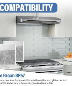 2. El Broan BP57 es un filtro de reemplazo de aluminio con cojín de carbón y lente de luz para la Serie de Campanas 43000, BUEZ3, SL6200R. elimina eficazmente la grasa y el aceite para garantizar un entorno de cocina más limpio y saludable.