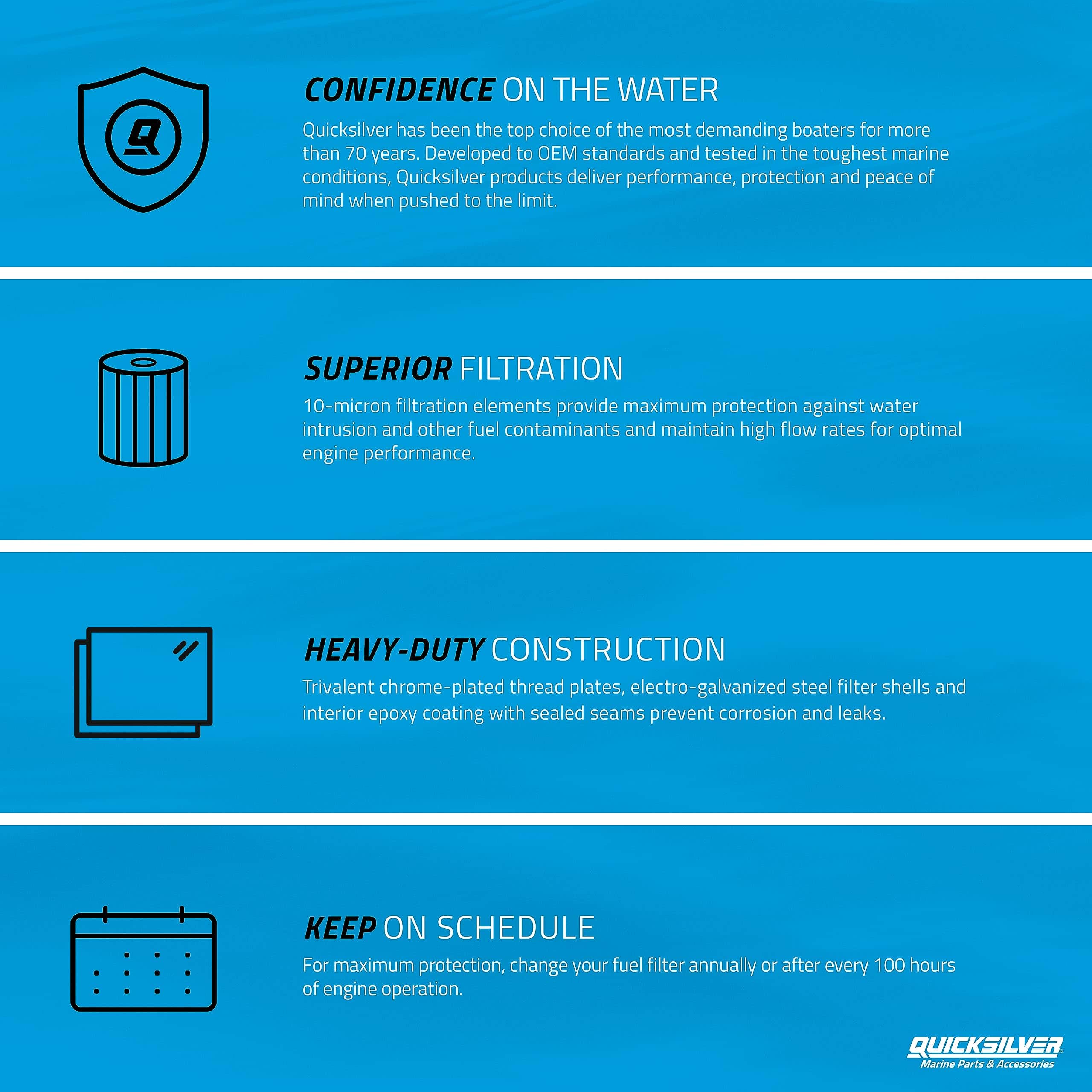 No deje que la humedad del agua u otros contaminantes del combustible le roben potencia a su motor. Filtrar esas partículas antes de que lleguen a su motor. Incluye filtro de repuesto y juntas de goma para la instalación. Se adapta a motores MerCruiser de empuje lateral e interiores Mercury/MerCruiser de 2004 en adelante con sistema de enfriador de combustible Gen III. La marca Quicksilver es líder en ofrecer aceites, piezas y accesorios para motores sin compromisos a la industria marina durante más de 65 años. Quicksilver es el proveedor de motores de repuesto originales de Mercury Marine, aceites y accesorios, pero también trabaja para servir a todas las marcas de equipos originales en las industrias marinas y de deportes de motor. Se ha ganado una fiel siguiente al proporcionar productos de la más alta calidad que se prueban en algunos de los entornos y procedimientos de prueba más rigurosos. Ninguna empresa de posventa se acerca al nivel de investigación y diseño como Quicksilver; comprar Quicksilver es comprar rendimiento, protección y tranquilidad.