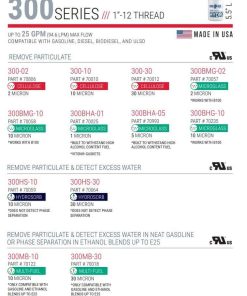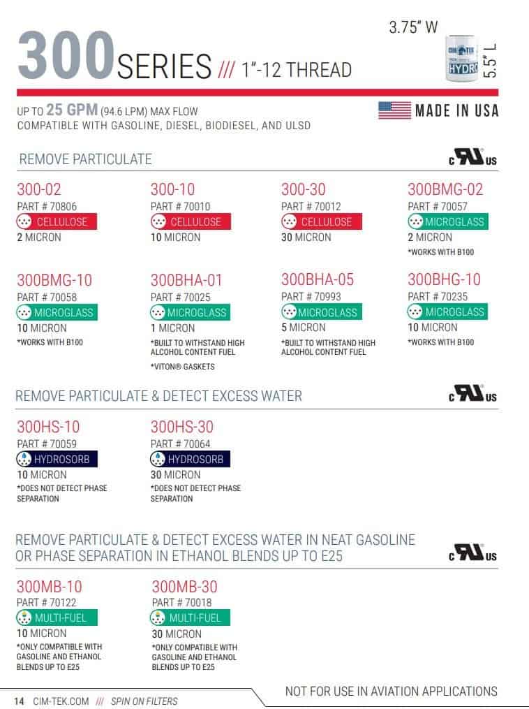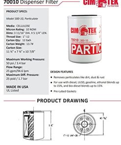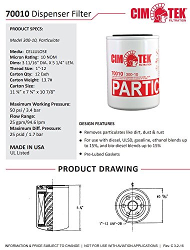 El filtro dispensador Cim-Tek 70010 elimina partículas como suciedad, polvo y óxido. Para uso con diésel, ULSD, gasolina, mezclas de etanol de hasta 15% y mezclas de biodiésel de hasta 15%. El flujo máximo es de 15 gpm/56 lpm. La presión de trabajo máxima es de 50 psi/3.4 bar. El 300-10, un nominal de 10 micrones, está recomendado para combustibles de gasolina y diésel. El 300-30, un nominal de 30 micrones, puede ser preferido para destilados más pesados como el diésel y los aceites combustibles. El 300-05 es un nominal de 5 micrones para una mayor eficiencia de filtración. Los Filtros de Giro de la Serie 300 tienen una apertura estándar de 3/4 in. requerida para la mayoría de las bombas y dispensadores de estaciones de servicio. Los Filtros de Giro de la Serie 300 son reconocidos por Underwriters Laboratories para su uso en bombas y dispensadores de estaciones de servicio. Los Filtros de Giro de la Serie 300 están disponibles con adaptadores de filtro de aluminio o hierro fundido para aplicaciones estándar.