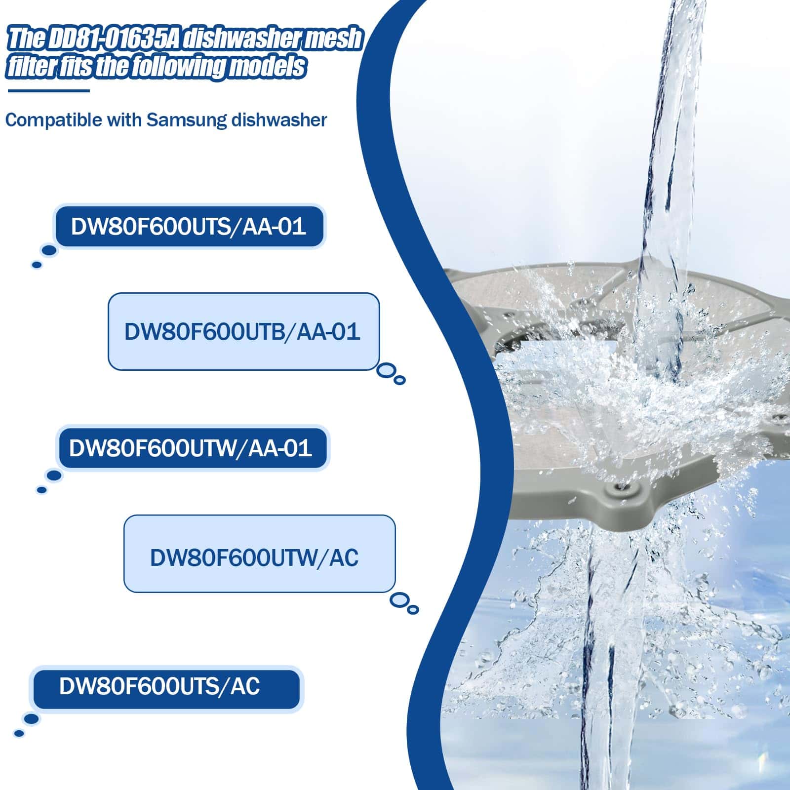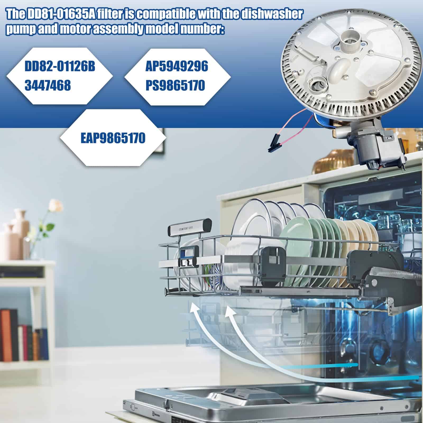 2. Modelos de bomba para lavavajillas Filtro de malla de lavavajillas DD81-01635A de repuesto, modelos compatibles de bomba y ensamblaje de motor para lavavajillas: DD82-01126B, 3447468, AP5949296, PS9865170, EAP9865170.
