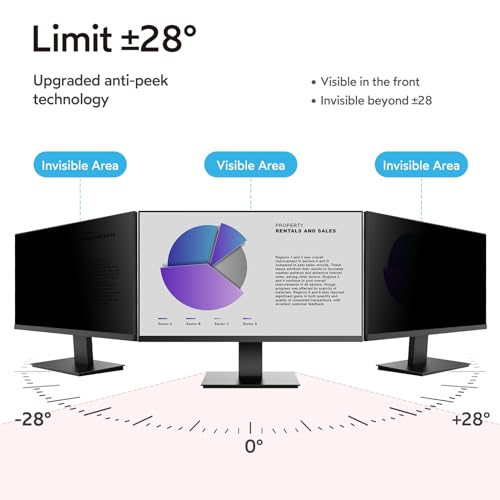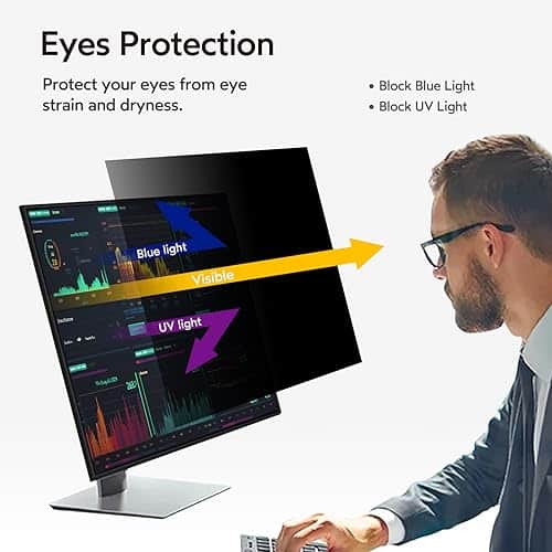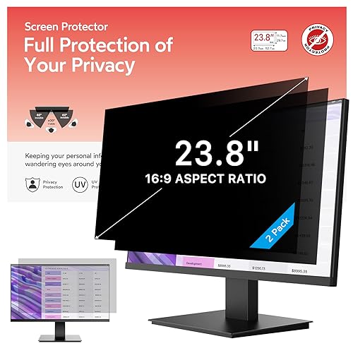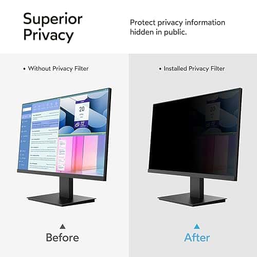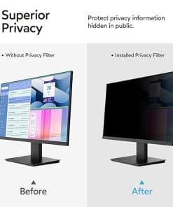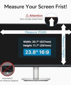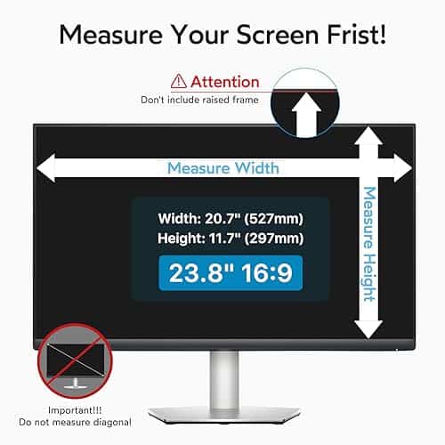 1. Perfecto para monitores de 23.8 pulgadas: Filtro de privacidad para ordenador modelado con una máquina real para garantizar un ajuste perfecto en tamaño. Adaptado a la pantalla del monitor de ordenador de 23.8 pulgadas con una relación de aspecto de 16:9, Ancho: 527 mm, Altura: 297 mm, Diagonal: 23.8″ (604.52 mm). Por favor, verifique las medidas de ancho y alto de su pantalla de ordenador antes de hacer el pedido. 2. Privacidad superior: Nuestro avanzado filtro de película multicapa mantiene una visión cristalina en el frente y oscurece la pantalla de privacidad de 23.8 pulgadas del monitor cuando se ve desde el lado, cuanto mayor sea el ángulo, más oscura será la pantalla. El filtro de privacidad de la computadora limita el ángulo de visión a 28, manteniendo su información importante confidencial y protegiendo la información sensible, lo que lo hace ideal para su uso en áreas de alto tráfico. 3. Protección de ojos y anti-reflejo: La tecnología anti-reflejo mejorada para la pantalla de privacidad de 23.8 pulgadas para monitor reduce el resplandor por encima del 90% y bloquea la luz dañina. Protege eficazmente sus ojos de daños y minimiza los efectos potencialmente dañinos en su vista, para que sus ojos no se sientan cansados después de un trabajo prolongado. La superficie mate de la pantalla de privacidad de la computadora de 23.8 pulgadas protege eficazmente su pantalla de huellas dactilares y polvo. 4. Úsela en cualquier momento / en cualquier lugar: Nuestro protector de pantalla de privacidad de computadora es la solución ideal para profesionales de la salud, trabajadores móviles, viajeros en transporte público, estudiantes y viajeros de negocios. Puede usarlo en cualquier lugar donde necesite proteger la privacidad de su pantalla, incluidas oficinas, cafeterías, aeropuertos, trenes, metros y áreas públicas. Disponible en cualquier momento y en cualquier lugar. 5. Fácil de instalar y dos opciones de fijación: Instalación sencilla, sin burbujas, a diferencia de los métodos tradicionales. La pantalla de privacidad del monitor tiene dos métodos de instalación únicos. Instalación fija (para cualquier pantalla de computadora): Aplique adhesivos directamente en el filtro de pantalla para sujetarlo en su lugar en la pantalla del monitor. Instalación removible (solo para pantallas con marco elevado): Utilice pestañas de montaje deslizables que se adhieren fácilmente al marco del monitor. Todas las herramientas están incluidas en el paquete.
