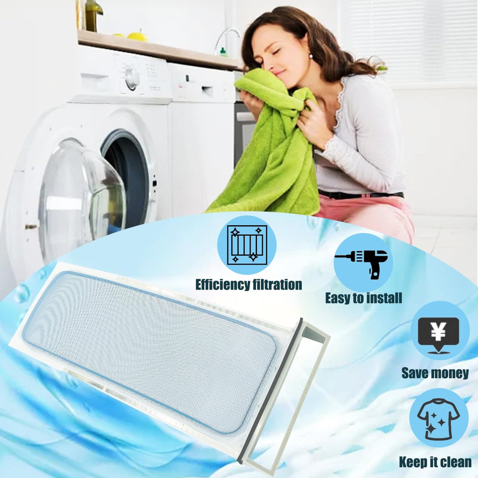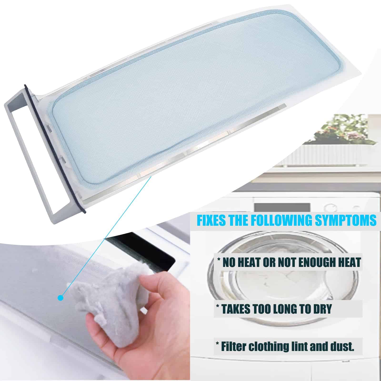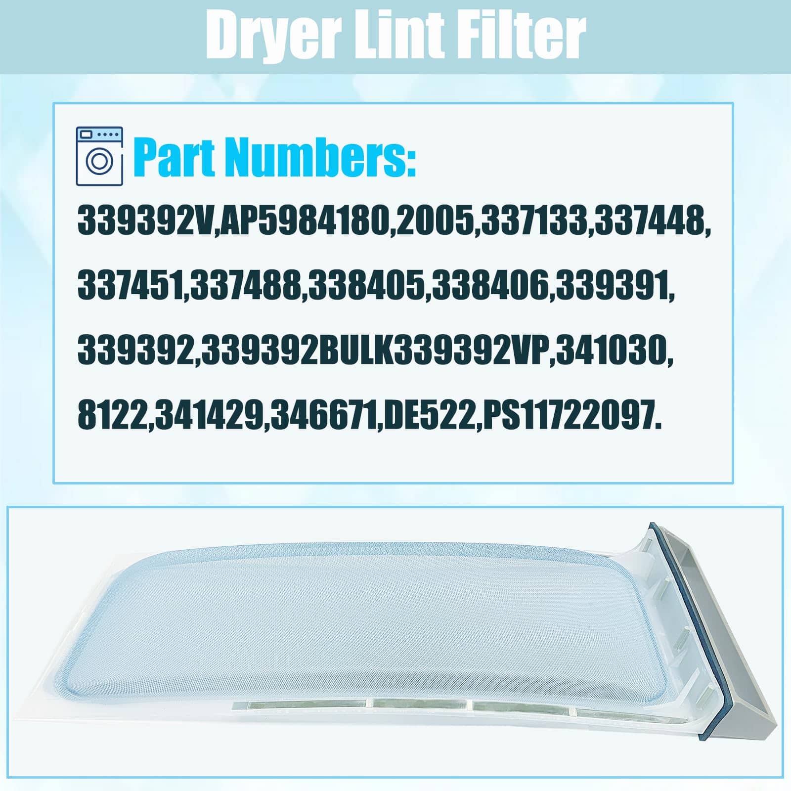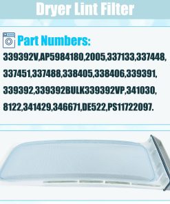 Filtro de pelusa para secadora para Whirlpool, Sears, AP2910660, PS345247, 339392. Filtro de pelusa completamente nuevo que reemplaza los modelos Whirlpool, Sears, Kenmore, Roper, Estate, KitchenAid, 339392. Medidas: 19-1/2″ X 7-1/4″. Se adapta a múltiples modelos de secadoras. Asegúrate de mantener limpio el filtro para que la secadora pueda funcionar de manera segura y eficiente. Reemplazar el filtro de pelusa de la secadora es fácil y es importante para el correcto funcionamiento del electrodoméstico.