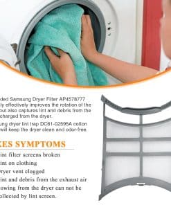 Descripción del producto: El diseño del Filtro de Pelusas para Secadora DC61-02595A es básicamente un marco termoplástico soportado por la pantalla de calibre fino. Una vez completada la secadora, el filtro de pelusas debe retirarse y abrirse para sacar las pelusas. La apertura y cierre constantes estresan la bisagra, y con el tiempo el termoplástico se fatiga y falla. El filtro debe mantenerse libre de pelusas, de lo contrario, puede acumularse y causar un fallo por sobrecarga térmica. Cambiar el filtro regularmente ayuda a prolongar la vida de la secadora. El paquete incluye: 1 x Filtro de Pelusas para Secadora DC61-02595A. Repara Síntomas: El filtro tiene una rotura o grieta, el filtro de pelusas está dañado y tarda demasiado tiempo en secar. Fácil de instalar: Antes de instalar este componente, desenchufe la secadora. Use guantes de trabajo para proteger sus manos. Si no ha quitado el viejo filtro de pelusas, simplemente retírelo y reemplácelo por uno nuevo. Pieza de repuesto: Samsung – DV520AGW/XAA, DV520AEW/XAA, DV455EVGSGR/AA-02, DV511AGR/XAA, DV42H5000EW/A3-00, DV42H5000EW/A3-01, DV42H5000EW/A3-02, DV42H5000EW/A3-03, DV42H5200EF/A3-00, DV520AEP/XAA-00, DV520AEP/XAA-01, DV520AEP/XAA-02, DV520AEW/XAA-00, DV520AEW/XAA-01, DV520AEW/XAA-02, DV520AGP/XAA-00, DV520AGP/XAA-01, DV520AGP/XAA-02, DV520AGP/XAA-03, DV520AGP/XAA-04, etc. Acerca de Blutoget: En Blutoget, no solo le proporcionamos productos de alta calidad, sino que también le ofrecemos un excelente servicio al cliente las 24 horas del día, los 7 días de la semana para garantizar su satisfacción. Las piezas de repuesto de Blutoget están hechas de materiales duraderos de alta calidad y no contienen sustancias químicas nocivas. A través de pruebas rigurosas y revisiones realizadas por ingenieros experimentados y equipos de desarrollo, garantizamos que todos los productos cumplen con los estándares OEM y son seguros de usar.
