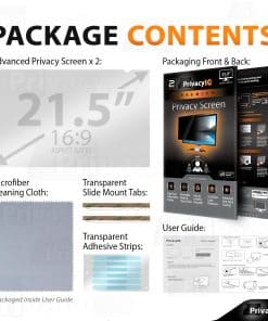 La pantalla de filtro de privacidad de 21,5 pulgadas de PrivacyIQ es perfecta para mantener su información privada segura mientras trabaja en espacios públicos o comparte su pantalla con otras personas. Con una relación de aspecto de 16:9 y dimensiones de 18 3/4″ de ancho, 10 9/16″ de altura y una diagonal de 21.5″, esta pantalla fue diseñada para adaptarse a una variedad de monitores de 21.5″ 16:9. Con opciones de instalación versátiles que incluyen tiras adhesivas de alta calidad o pestañas de montaje deslizantes, usted puede elegir la solución que mejor se adapte a sus necesidades. Además de la protección de privacidad de 60 grados, esta pantalla también proporciona protección contra la luz azul, protección contra la luz UV y propiedades anti-reflectantes para ayudar a reducir la fatiga visual y prevenir dolores de cabeza. Con el paquete que incluye el filtro de 21.5″, paño de limpieza, cinta adhesiva y pestañas colgantes, tendrá todo lo que necesita para instalar y utilizar su PrivacyIQ con facilidad. Mantenga su información segura y su vista protegida con el filtro de privacidad de monitor de 21.5 pulgadas de PrivacyIQ.