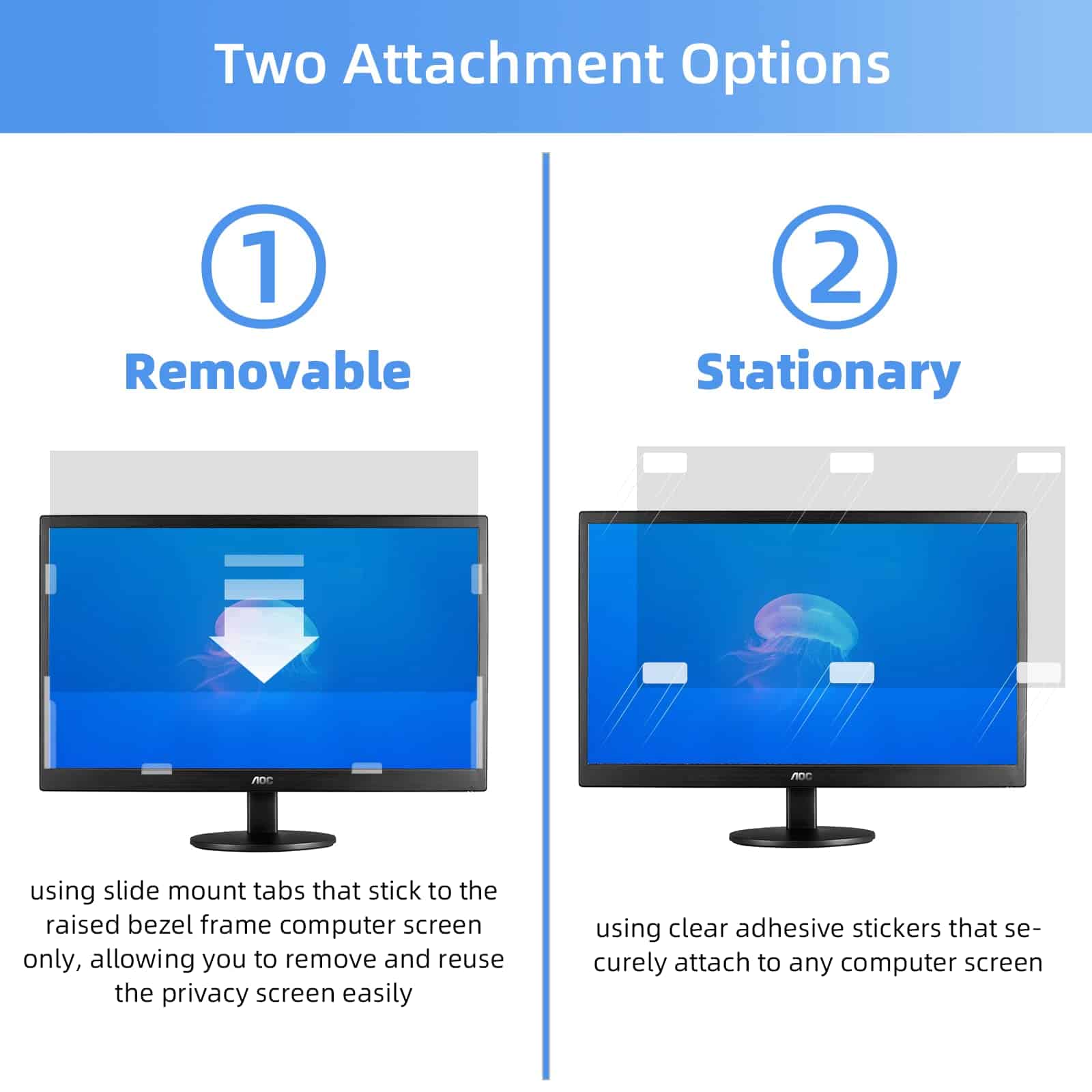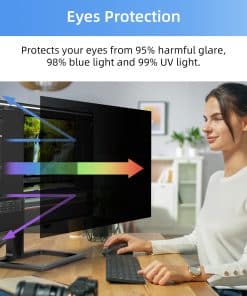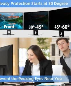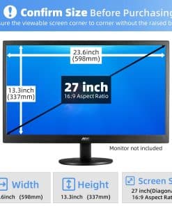 1. Dimensiones del Filtro de Privacidad Ancho: 23 9/16″ (23.6 pulgadas/598 mm), Altura: 13 1/4″ (13.3 pulgadas/337 mm) – Relación de Aspecto 16:9. Contacte con nosotros si tiene preguntas sobre las dimensiones. El filtro de privacidad de pantalla de computadora Mamol está diseñado para ser compatible con las marcas de monitores HP, Samsung, Dell, Lenovo, Acer, Asus, LG, ViewSonic y otras marcas. Por favor, confirme las medidas de ancho y alto de la pantalla de su computadora antes de realizar el pedido. 2. Privacidad Superior El filtro de privacidad de pantalla de computadora Mamol de 27 pulgadas está diseñado con tecnología avanzada de microláminas para bloquear la visibilidad a aproximadamente 30 grados y oscurecer completamente las pantallas cerca de 60 grados. El filtro de privacidad de pantalla de computadora mantiene la información electrónica confidencial, lo que lo hace excelente para su uso en áreas de alto tráfico. 3. Protección para los Ojos Este filtro de privacidad de monitor negro filtra el 99,9% de los rayos UV y reduce la luz azul en un 98% para reducir la fatiga visual y minimizar los efectos potencialmente dañinos en la vista. Como un filtro de privacidad de pantalla reversible de 27 pulgadas: elija el lado brillante para mayor claridad y privacidad mejorada o elija el lado mate para minimizar el resplandor y la reflexión molesta. Cubre las necesidades de su uso diario. 4. Dos Opciones de Fijación 1) Aplique pegatinas adhesivas transparentes directamente en el filtro de pantalla para sostenerlo en su lugar en la pantalla del monitor; 2) Instale estos soportes de montaje de plástico en el borde exterior de la pantalla para sostener el filtro de privacidad en su lugar (solo para pantallas de computadora de 27 pulgadas con un bisel elevado), lo que le permite deslizar el filtro sobre y fuera de la pantalla según sea necesario. Todos los accesorios e instrucciones de instalación están incluidos en el paquete. 5. Soporte de por Vida Los filtros de privacidad de pantalla de monitor de 27 pulgadas Mamol están protegidos bajo la política de por vida de Mamol y si sucede algo, le enviaremos una nueva pantalla de privacidad sin costo alguno. Así que no dude en realizar un pedido, brindando a su pantalla de computadora la mejor privacidad y protección mientras trabaja en viajes o espacios de trabajo abiertos.