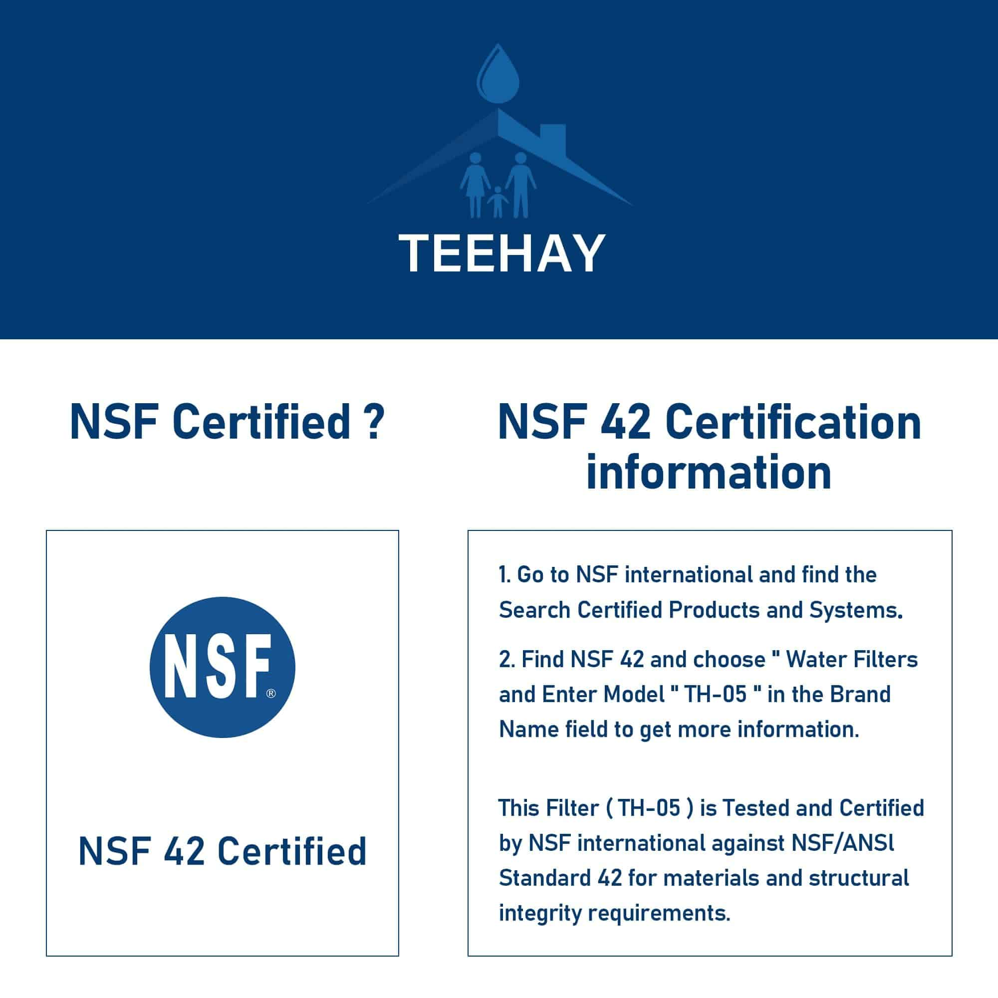 1. Este filtro (TH-05) está probado y certificado por NSF internacional contra la norma NSF/ANSI 42 para los requisitos de integridad de materiales y estructurales.